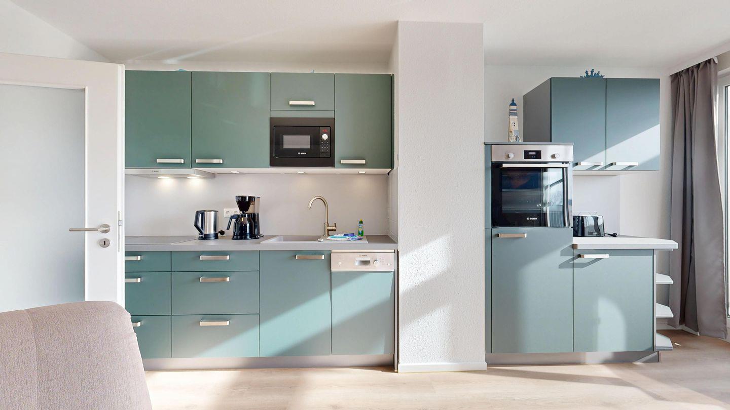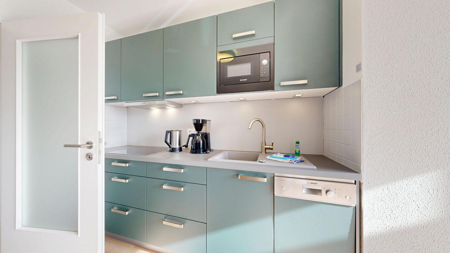 * Küchenzeile mit Spülmaschine, Ceranfeld, Mikrowelle, Kaffeemaschine, Toaster und Kühlschrank mit Gefrierfach