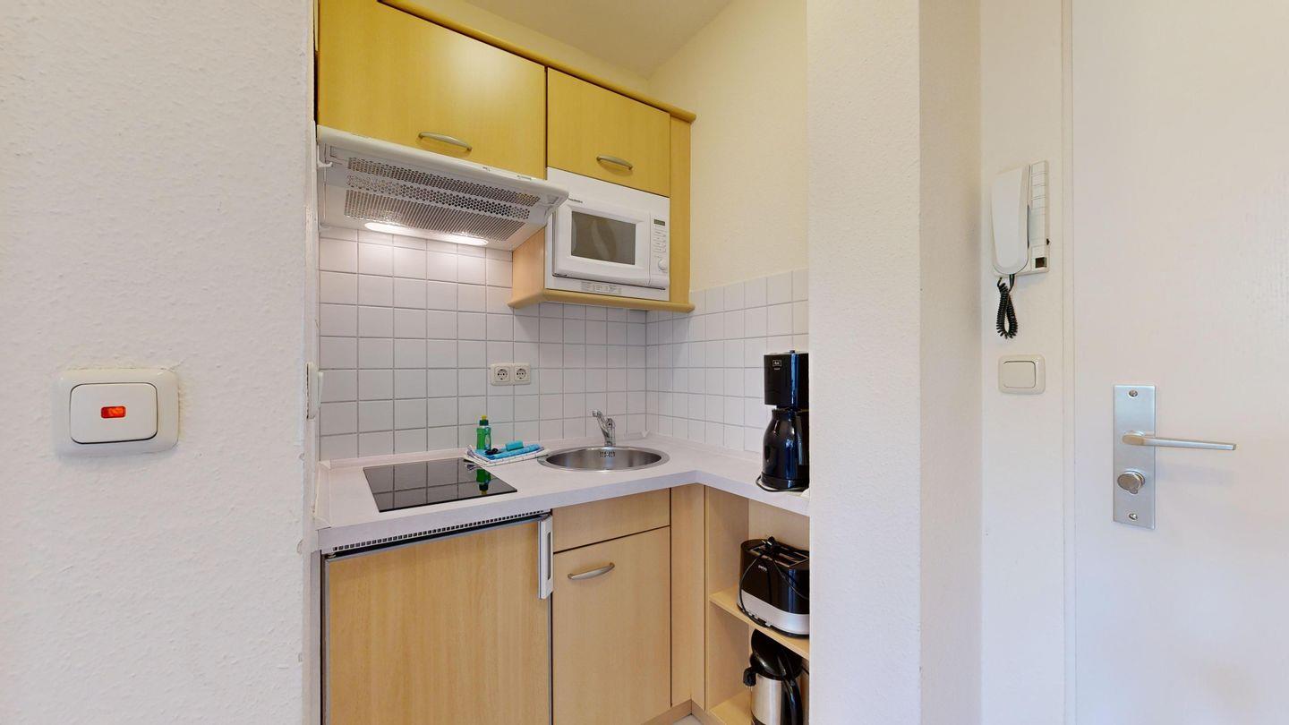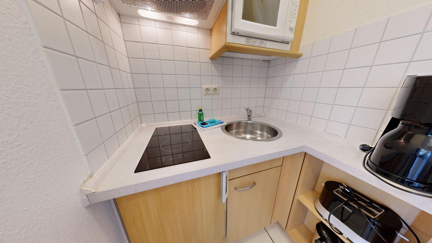 * Küchenzeile mit Ceranfeld, Mikrowelle, Kaffeemaschine, Toaster und Kühlschrank