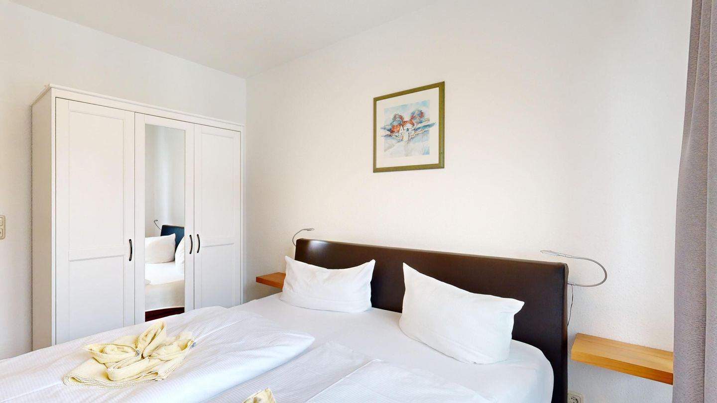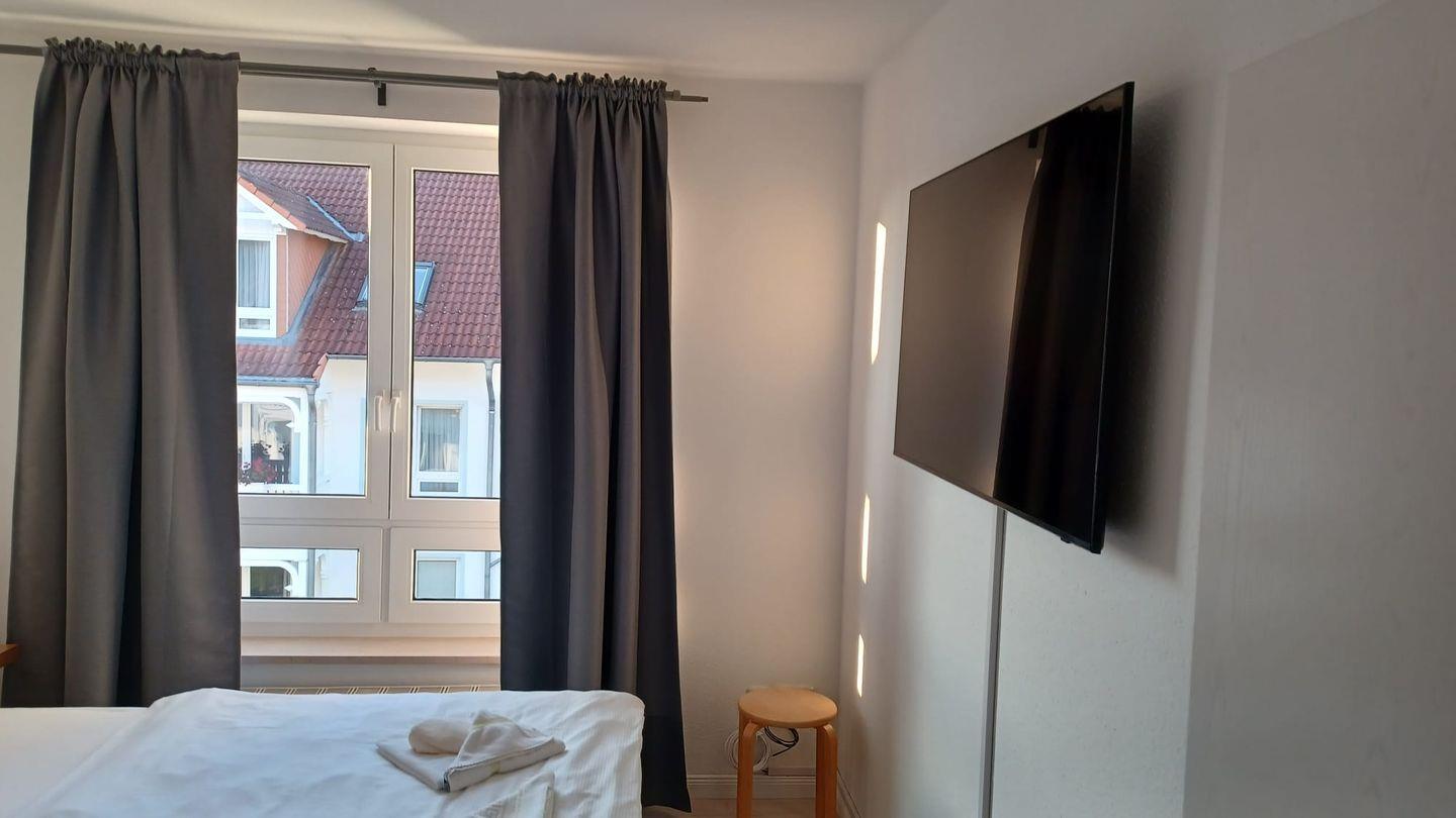 * 1 Schlafzimmer mit einem Boxspringbett (Doppelbett) und TV
