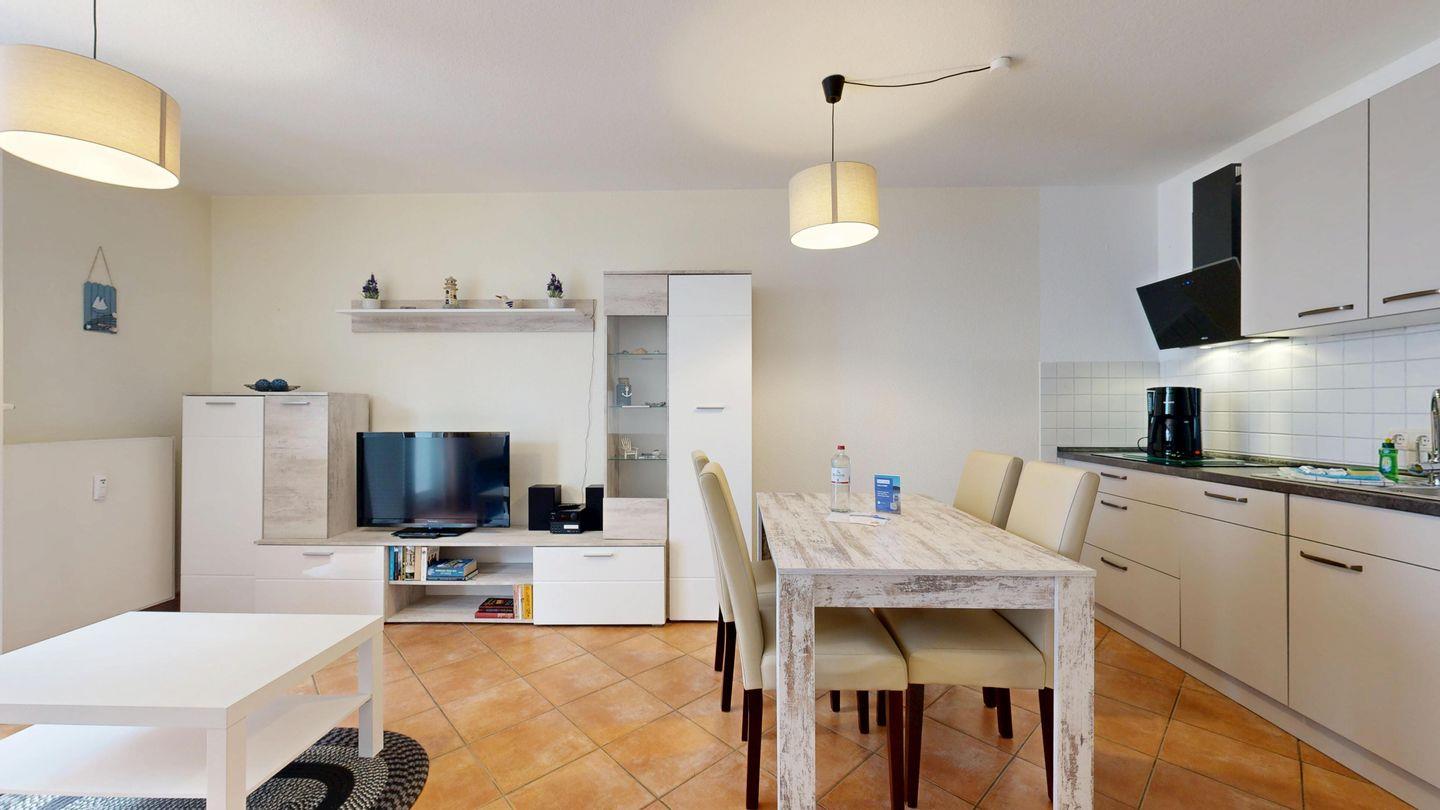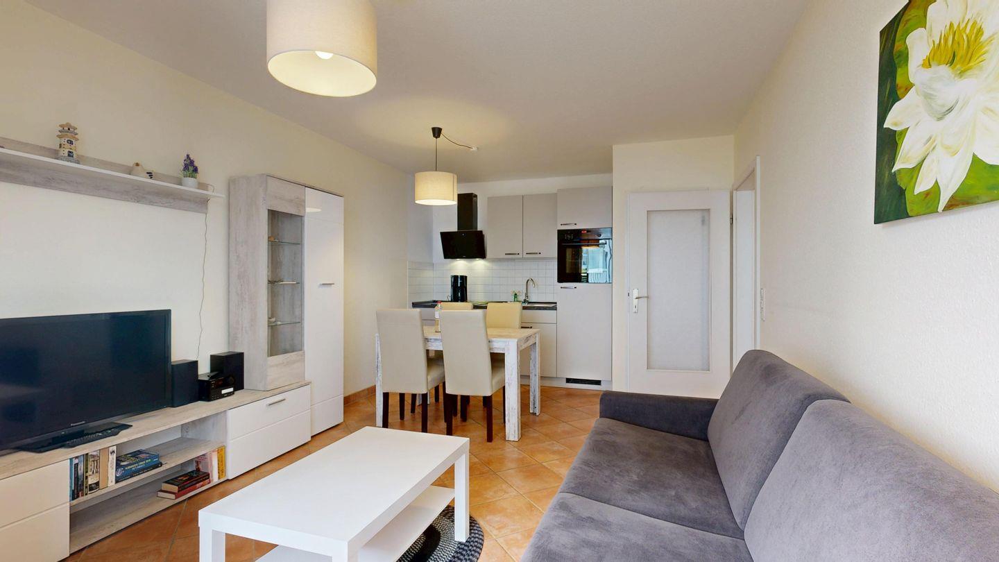 * Wohnzimmer: Couchgarnitur (Schlafgelegenheit für 2 Personen), Kabel-TV, Stereoanlage, Internetanschluss (WLAN), Esstisch
