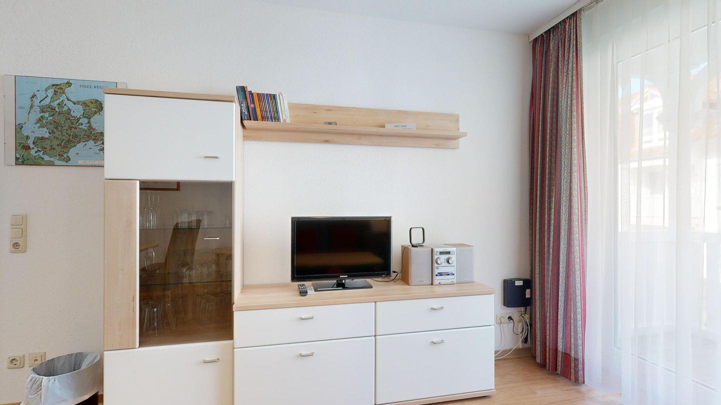 * Wohnzimmer: Couchgarnitur (Schlafgelegenheit für 2 Personen), Kabel-TV, Stereoanlage, Internetanschluss (WLAN), Esstisch