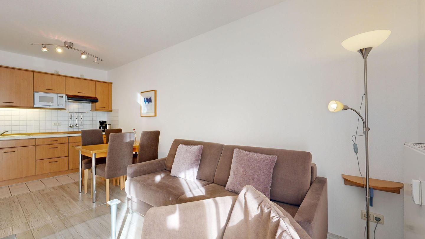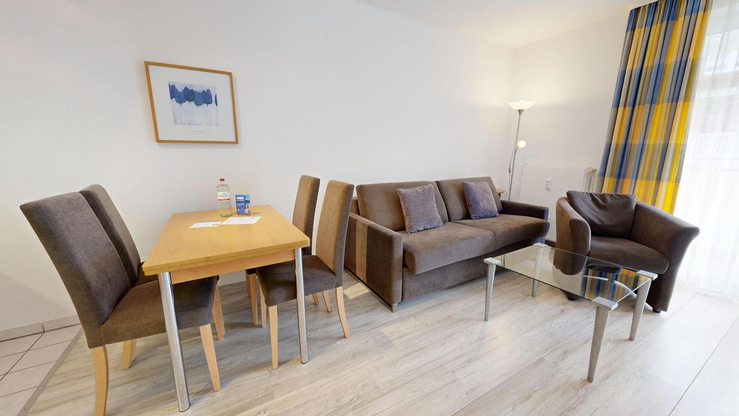 * Wohnzimmer: Couchgarnitur (Schlafgelegenheit für 2 Personen), Kabel-TV, Stereoanlage, Internetanschluss (WLAN), Esstisch