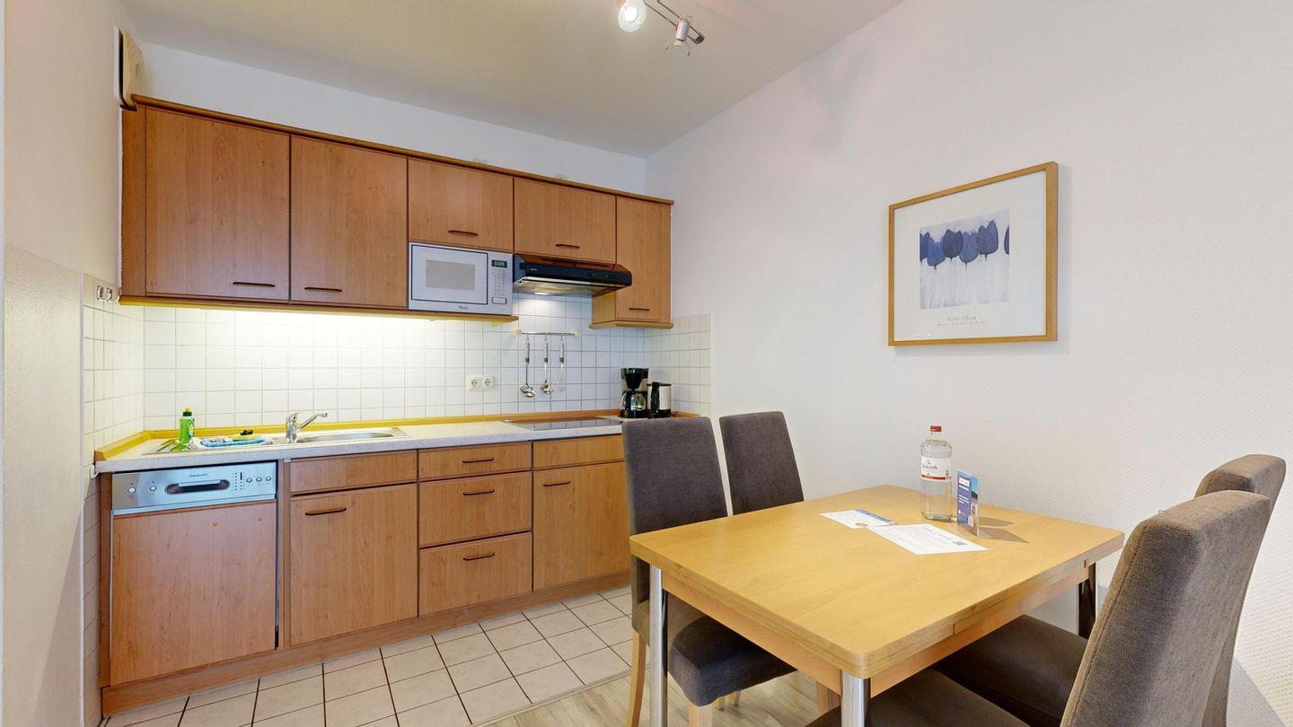 * Küchenzeile mit Spülmaschine, Ceranfeld, Mikrowelle mit Grillfunktion, Kaffeemaschine, Toaster und Kühlschrank mit Gefrierfach