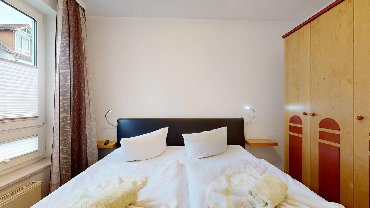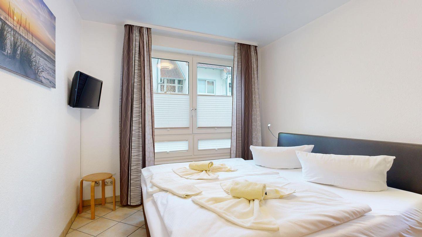 * 1 Schlafzimmer mit einem Boxspringbett (Doppelbett) und TV