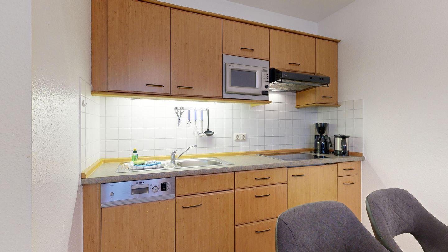* Küchenzeile mit Spülmaschine, Ceranfeld, Mikrowelle, Kaffeemaschine, Toaster und Kühlschrank
