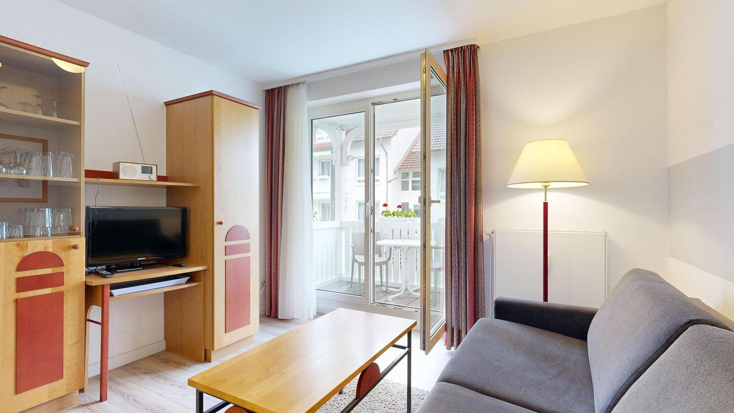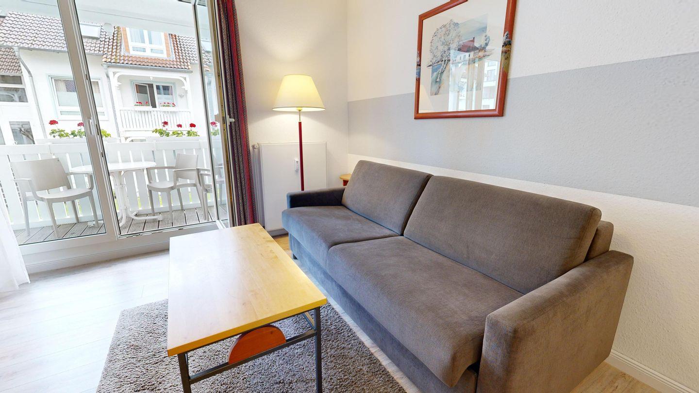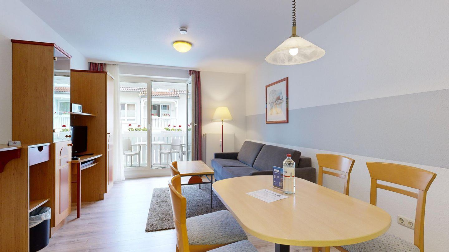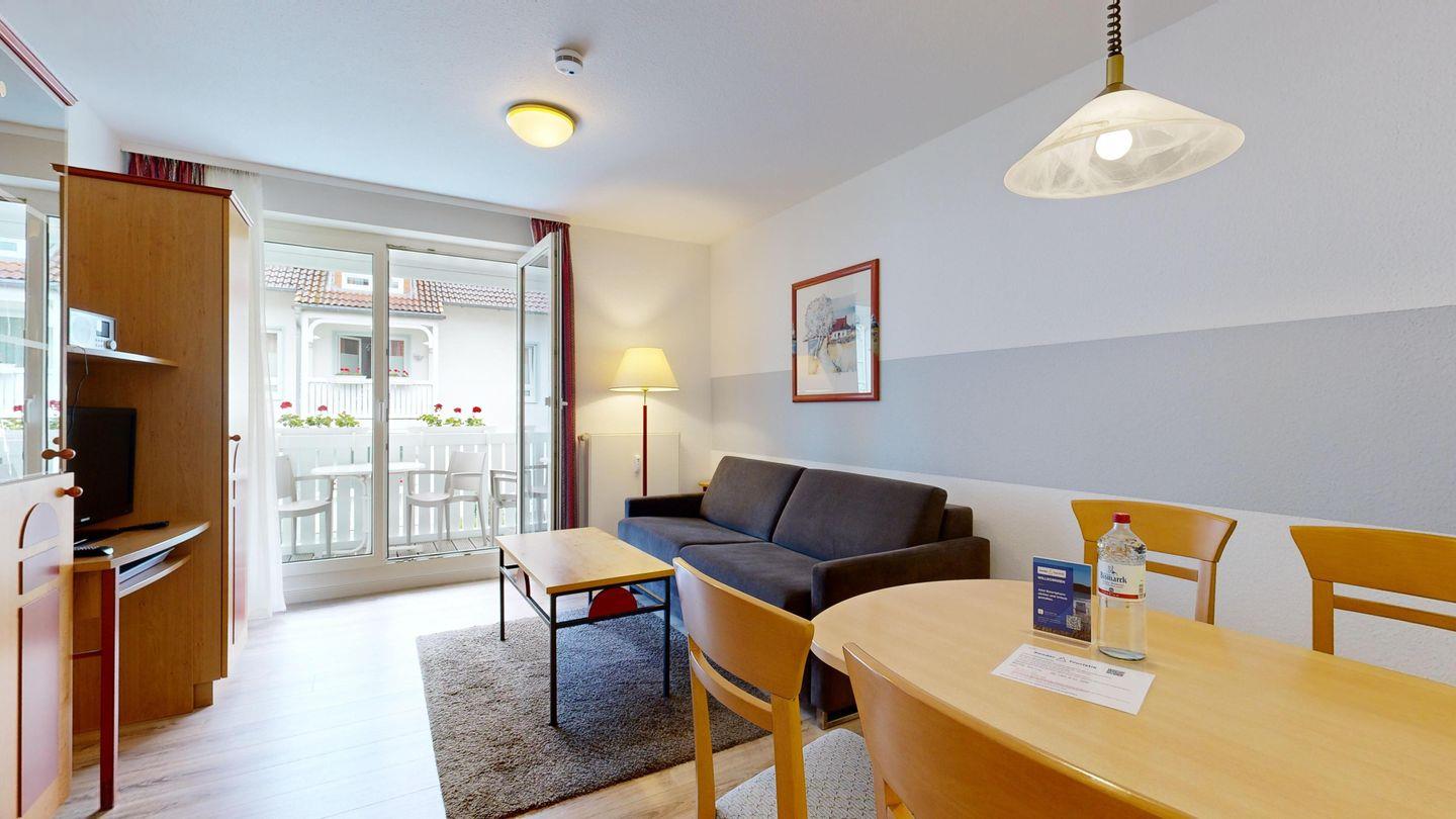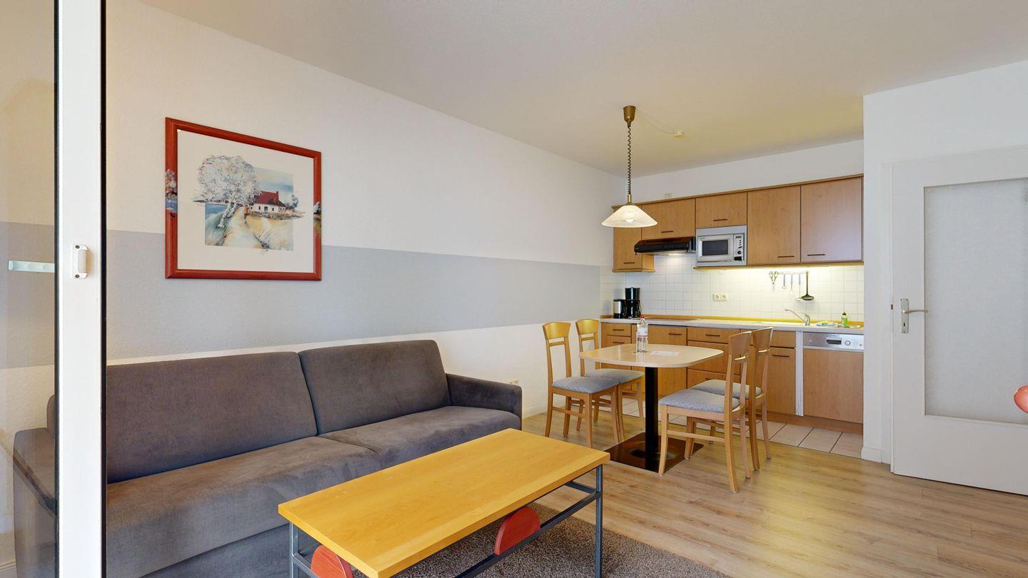* Wohnzimmer: Couchgarnitur (Schlafgelegenheit für 2 Personen), Kabel-TV, Stereoanlage, Internetanschluss (WLAN), Esstisch
