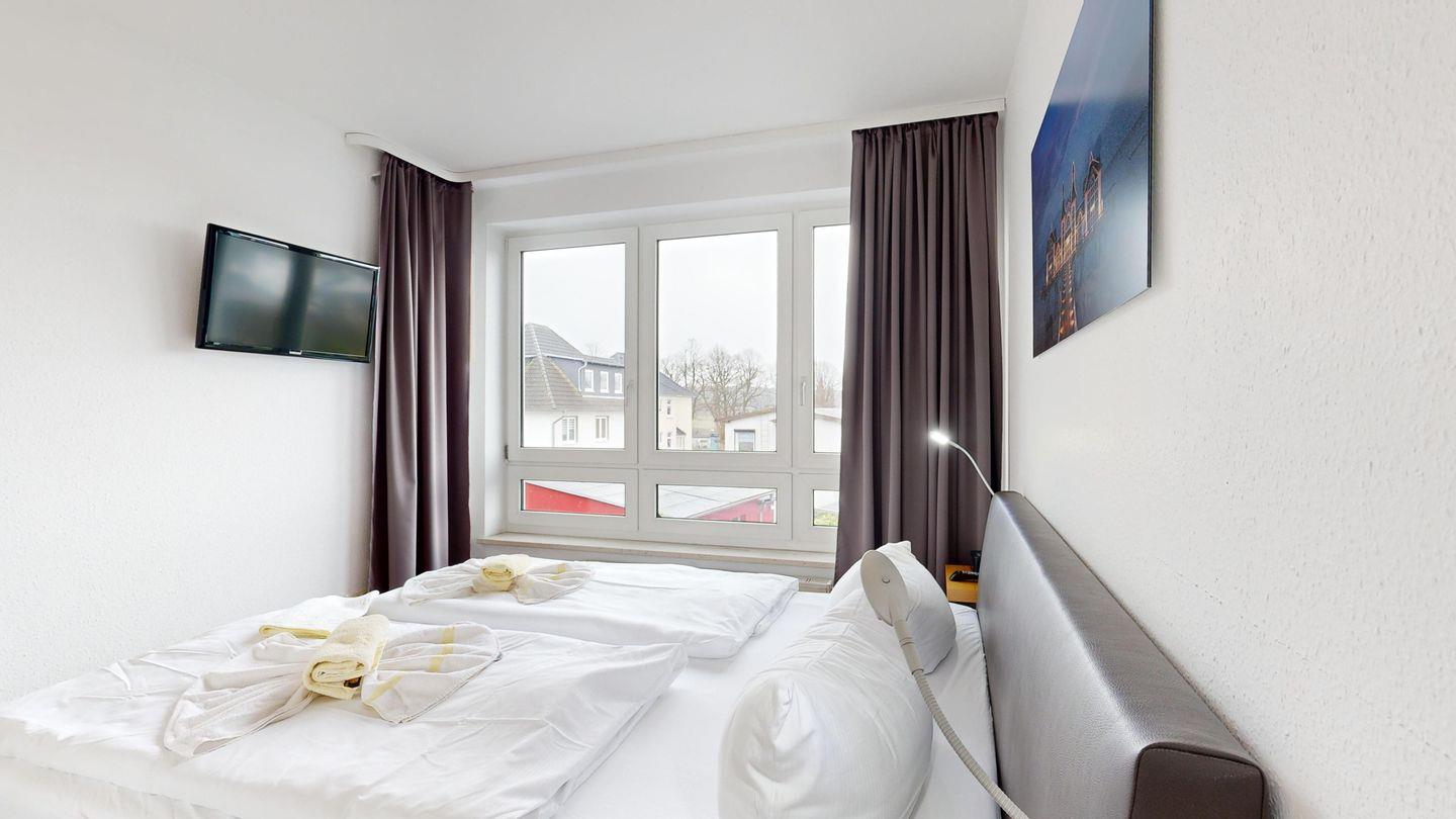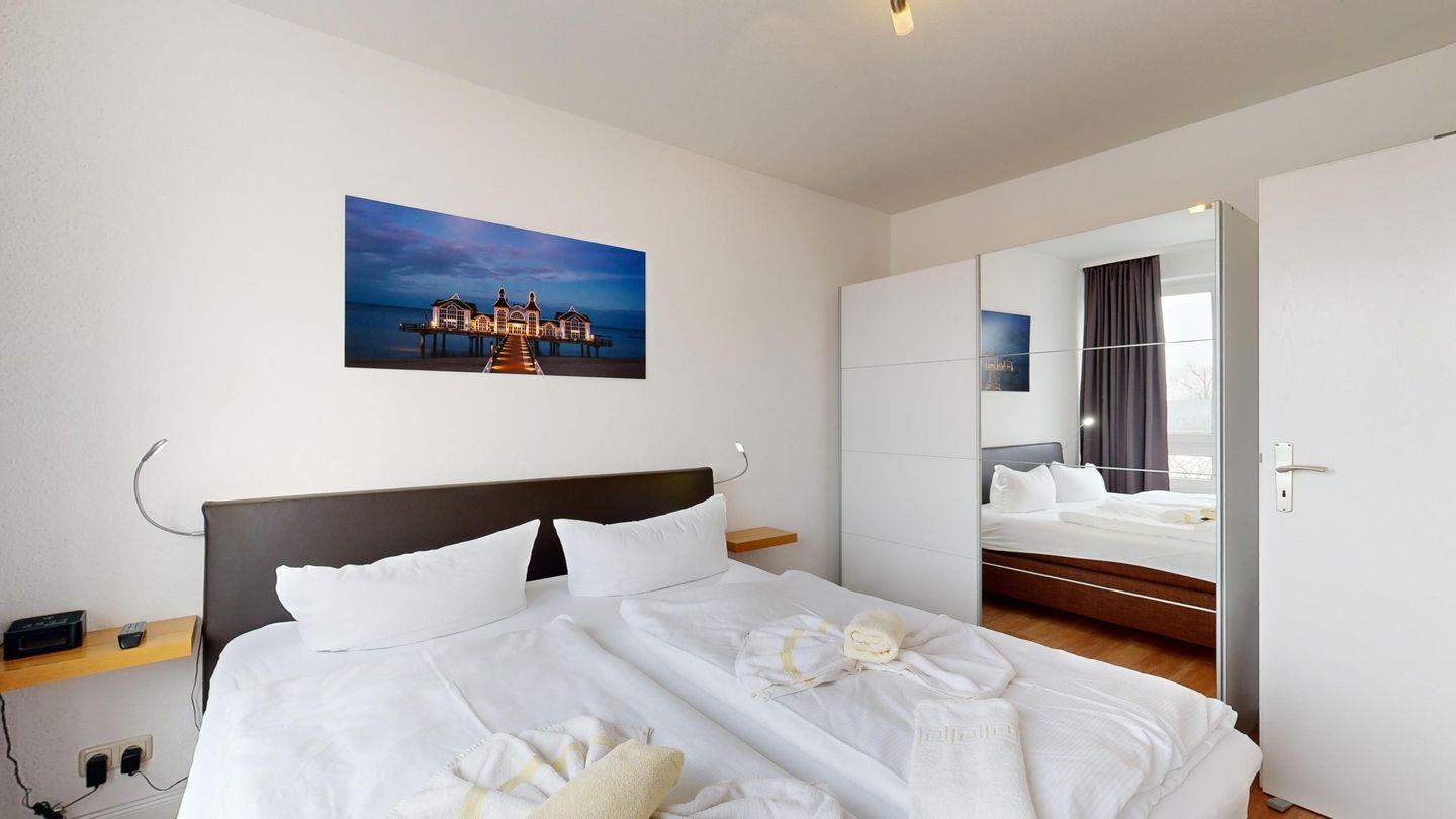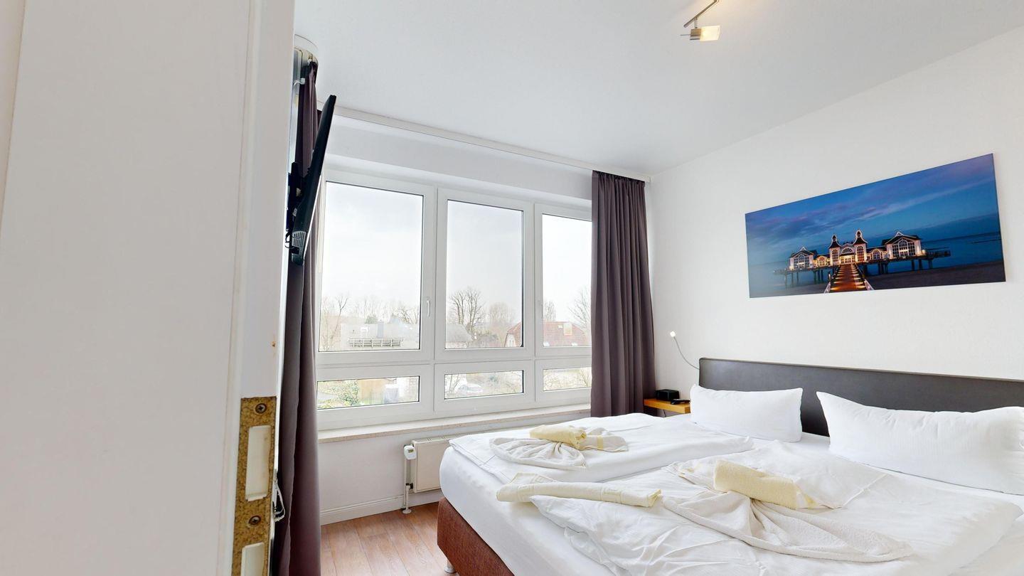 * 1 Schlafzimmer mit einem Boxspringbett (Doppelbett) und TV, ausklappbarer Schreibtisch hinter der Tür