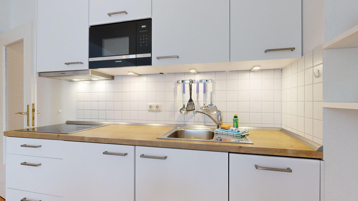 * Küchenzeile mit Spülmaschine, Ceranfeld, Mikrowelle mit Grillfunktion, Kaffeemaschine, Toaster und Kühlschrank mit Gefrierfach