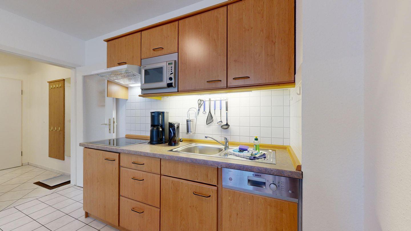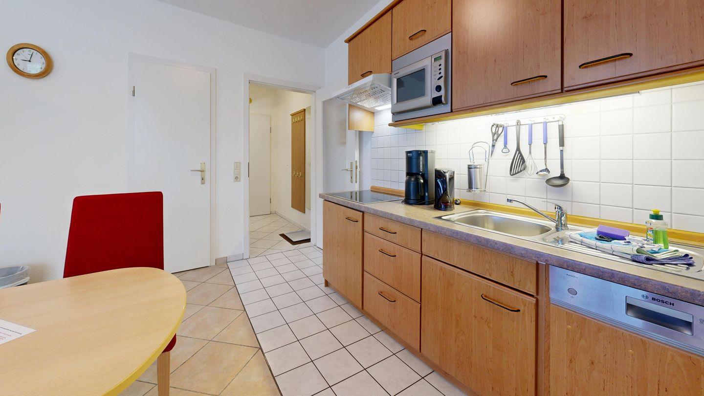 * Küchenzeile mit Spülmaschine, Ceranfeld, Mikrowelle, Kaffeemaschine, Toaster und Kühlschrank mit Gefrierfach