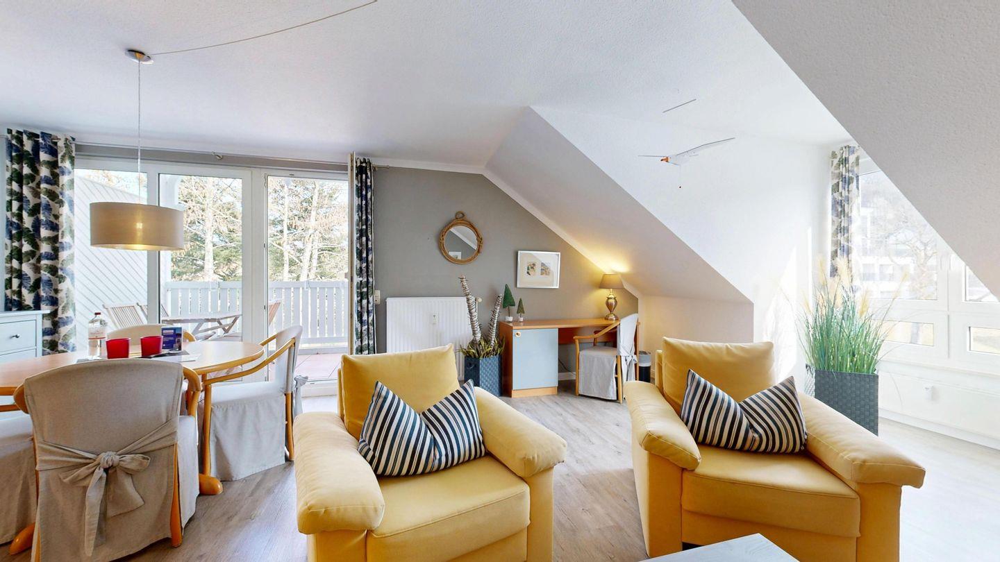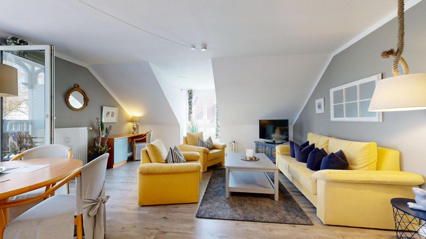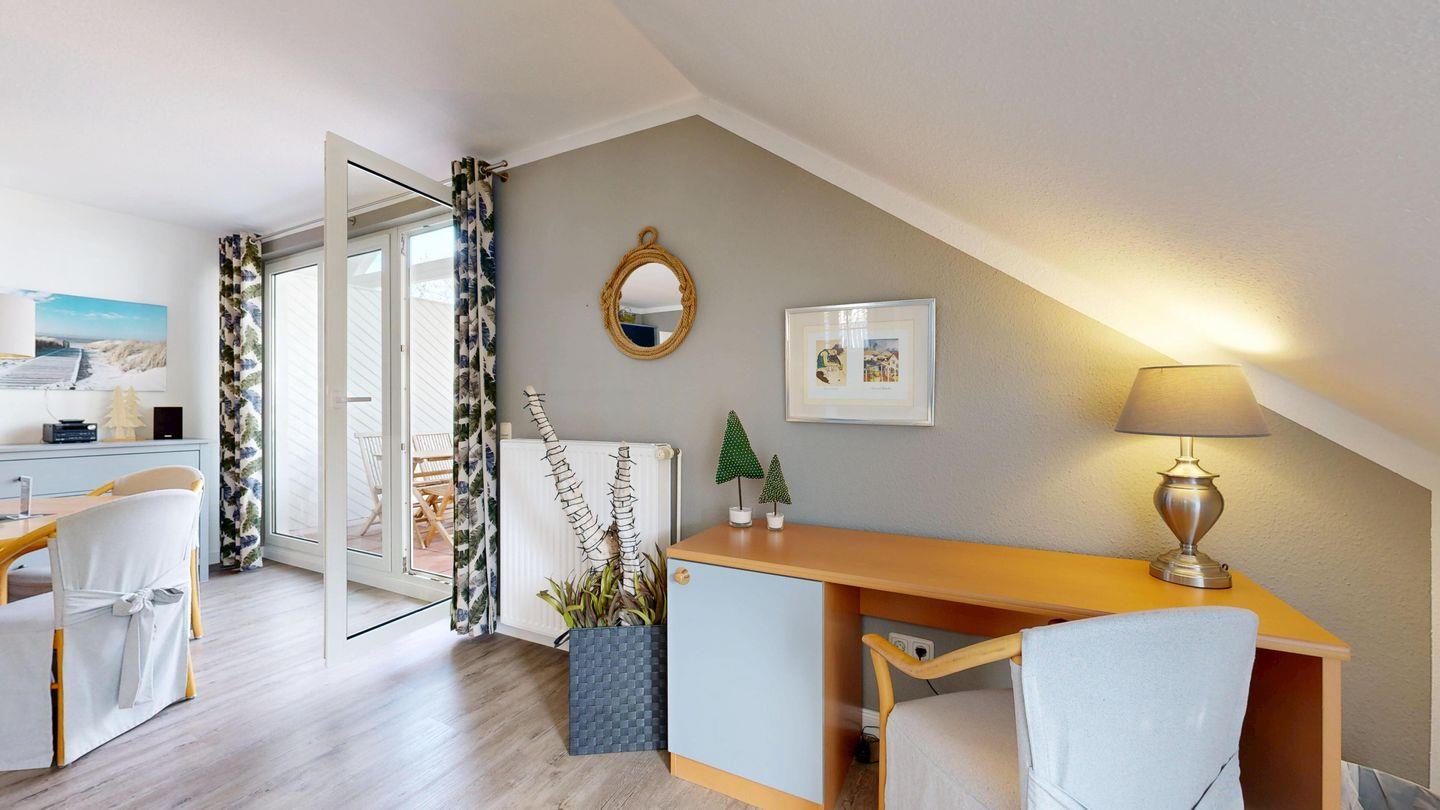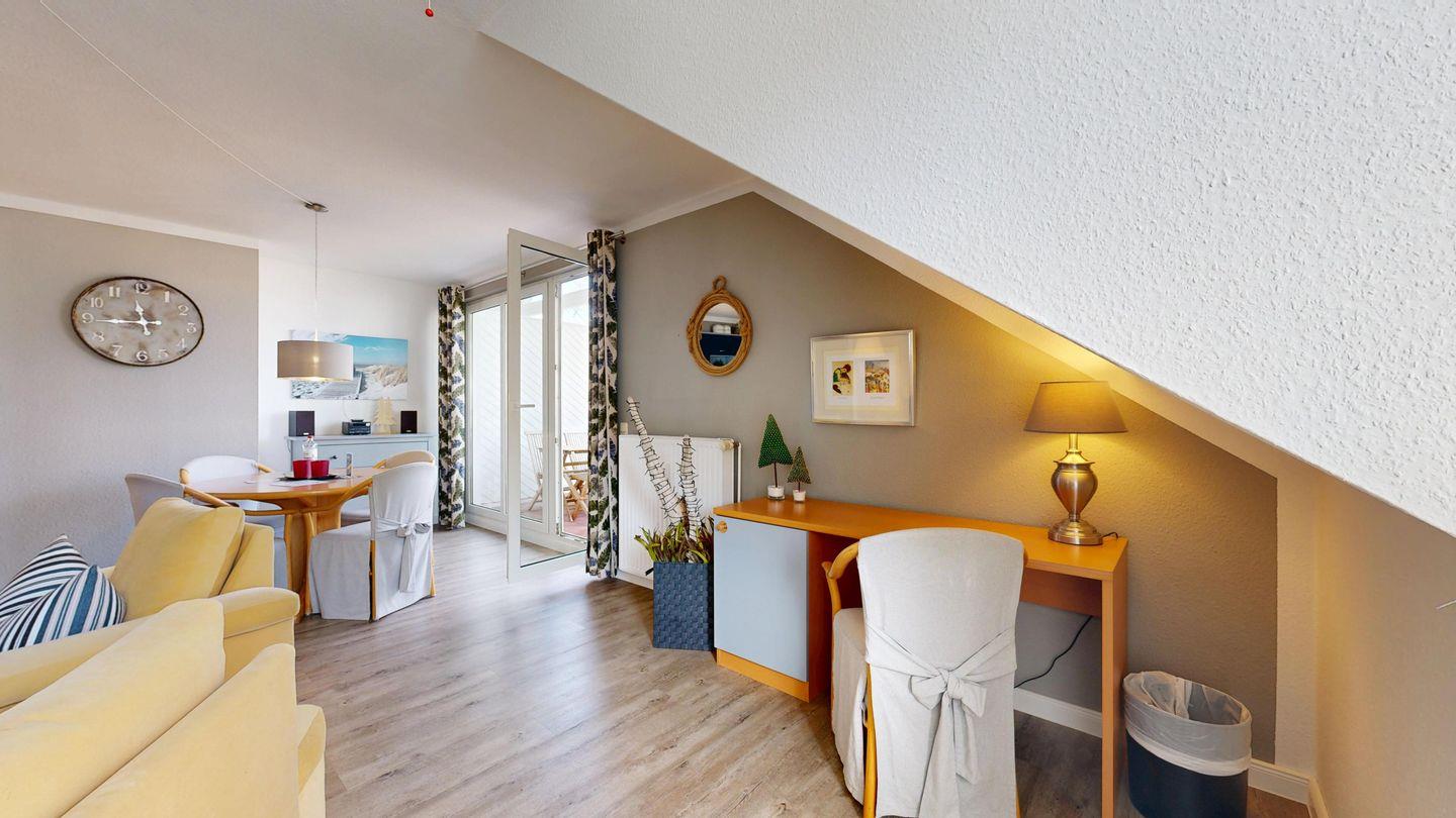 * Wohnzimmer: Couchgarnitur (Schlafgelegenheit für 2 Personen), 2 Sessel, Kabel-TV, Stereoanlage, Internetanschluss (WLAN), Esstisch und Schreibtisch