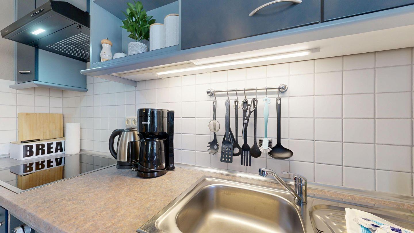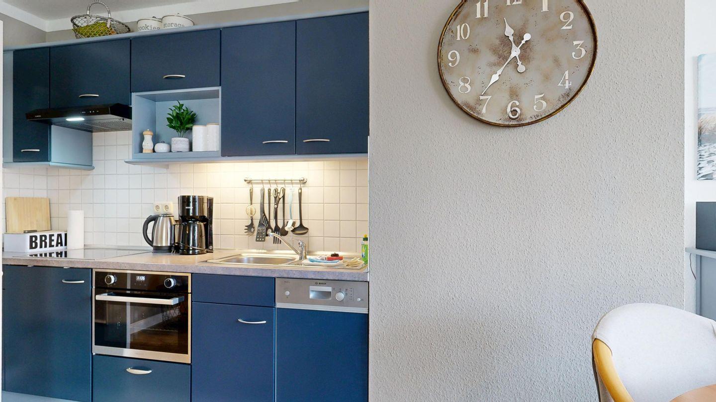 * Küchenzeile mit Spülmaschine, Ceranfeld, Mikrowelle, Kaffeemaschine, Toaster und Kühlschrank mit Gefrierfach