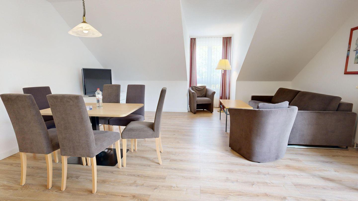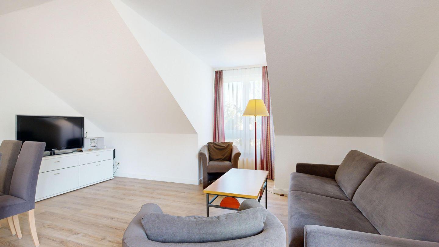 * Wohnzimmer: Couchgarnitur (Schlafgelegenheit für 2 Personen), Kabel-TV, Stereoanlage, Internetanschluss (WLAN), Esstisch