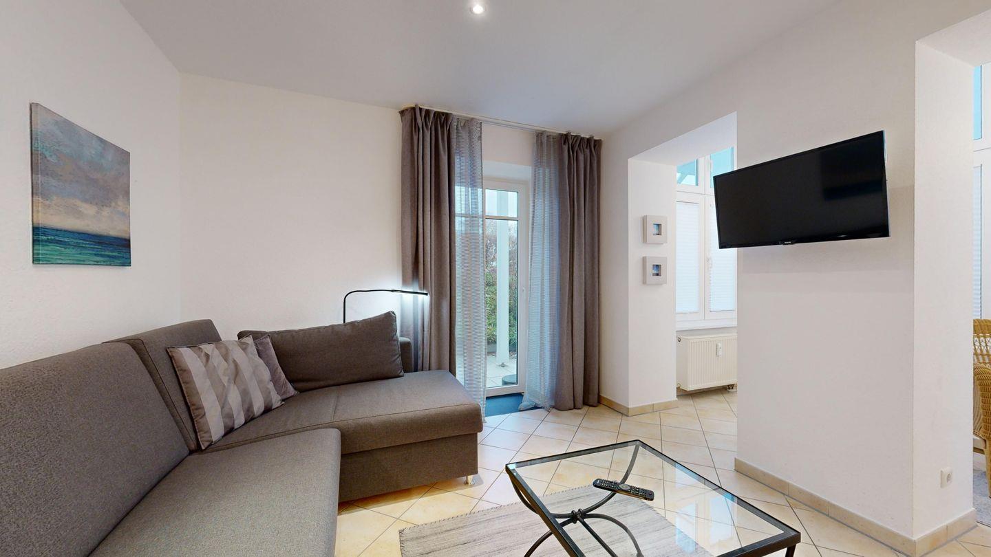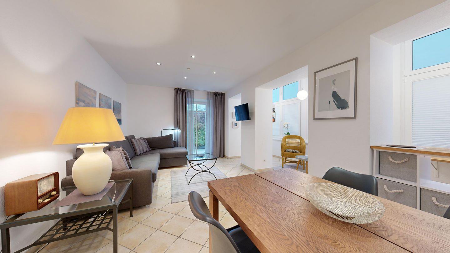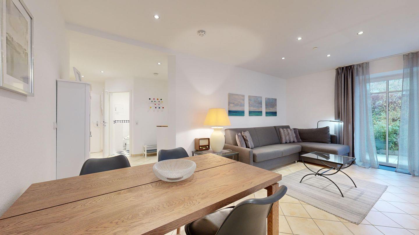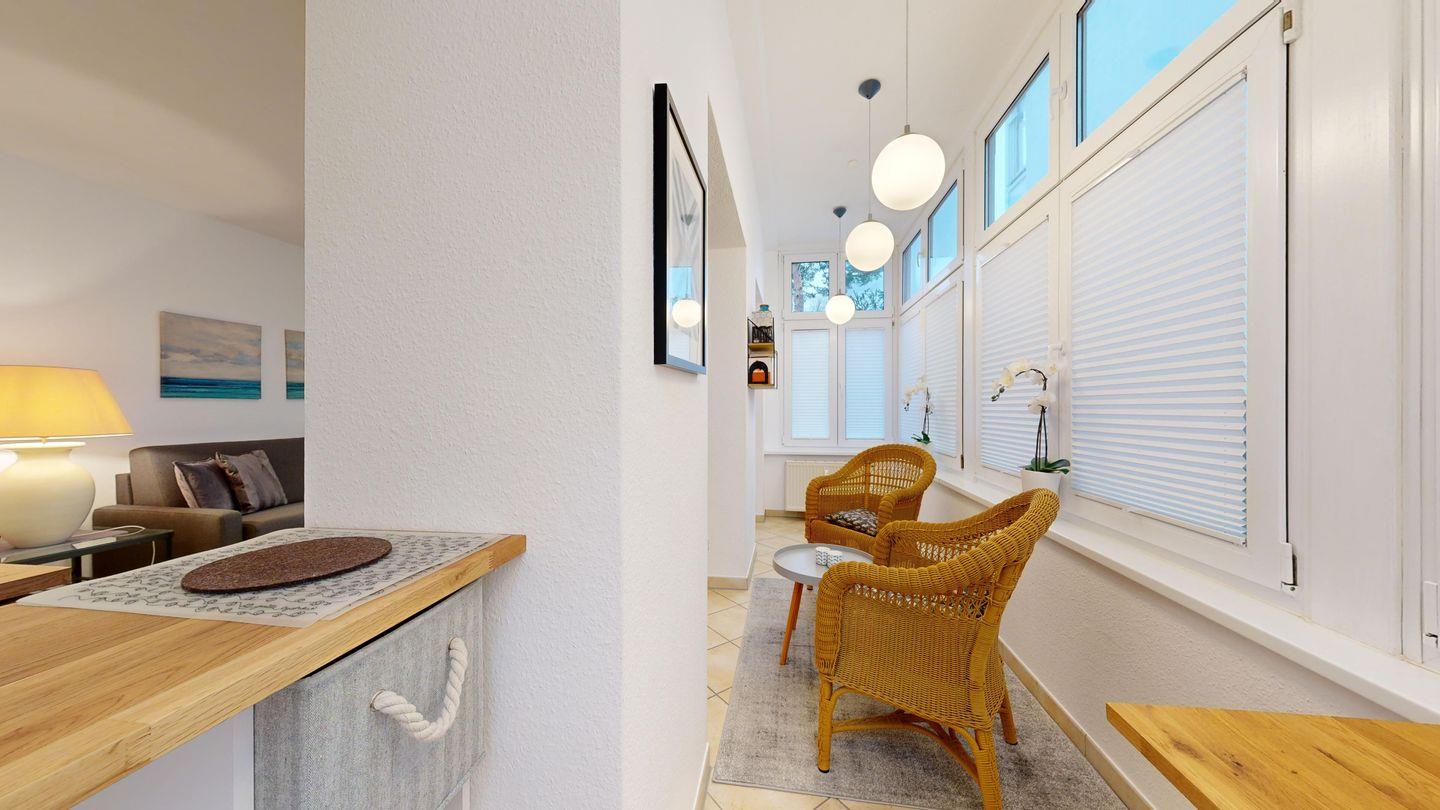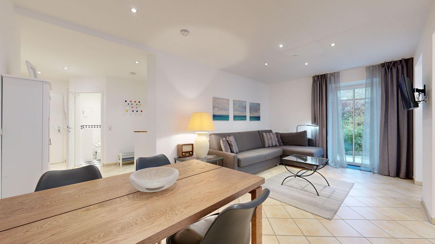 Moderne Ferienwohnung am Binzer Strand mit Strandkorb und Südterrasse für erholsame Tage.