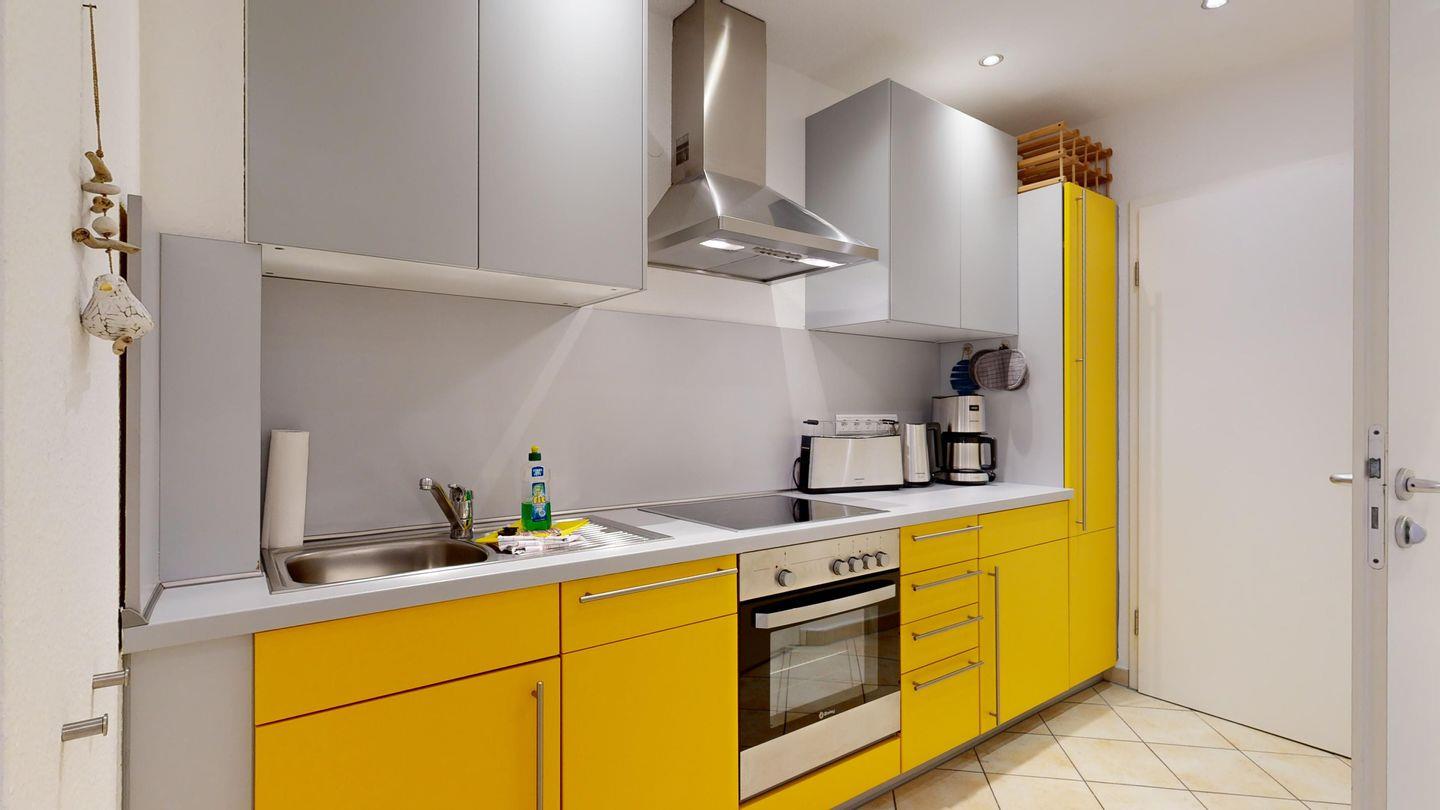 * Küche: Moderne Küchenzeile mit Ceran-Herd, Spülmaschine, Kaffeemaschine, Wasserkocher und Toaster