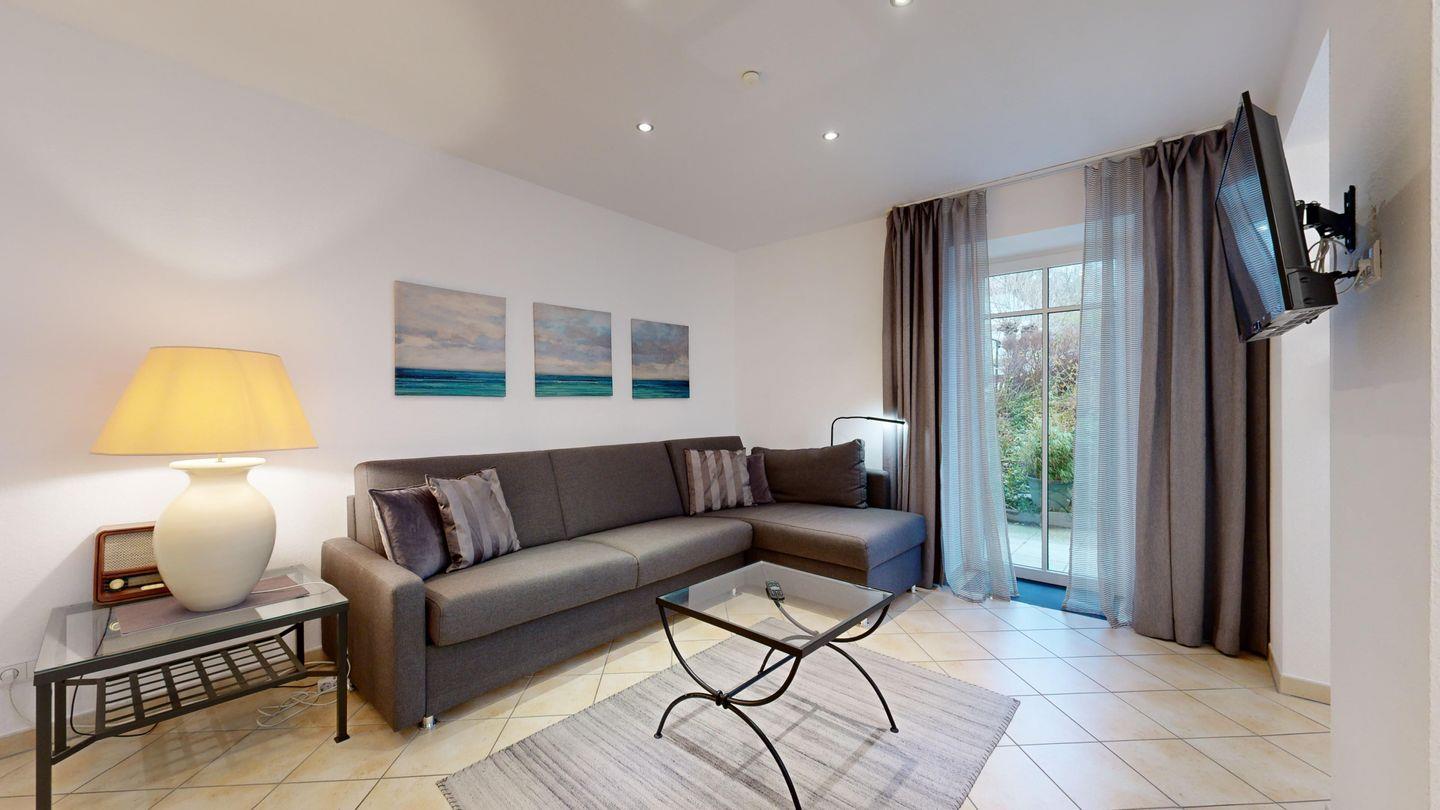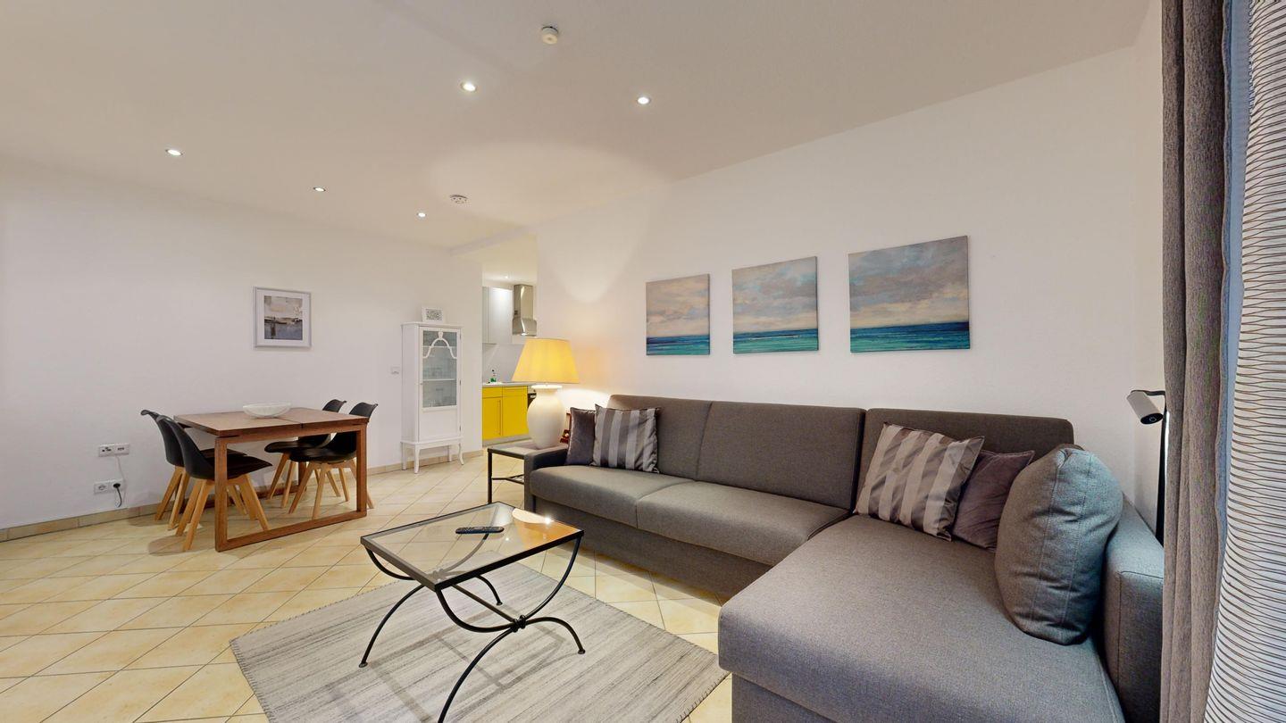 * Wohnzimmer: Moderne Couchgarnitur (Schlafgelegenheit für 1-2 Personen, 1,60 m breit), Kabel-TV, WLAN-Internetanschluss, Radio mit USB Port, Essplatz
