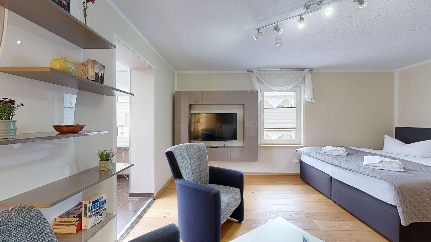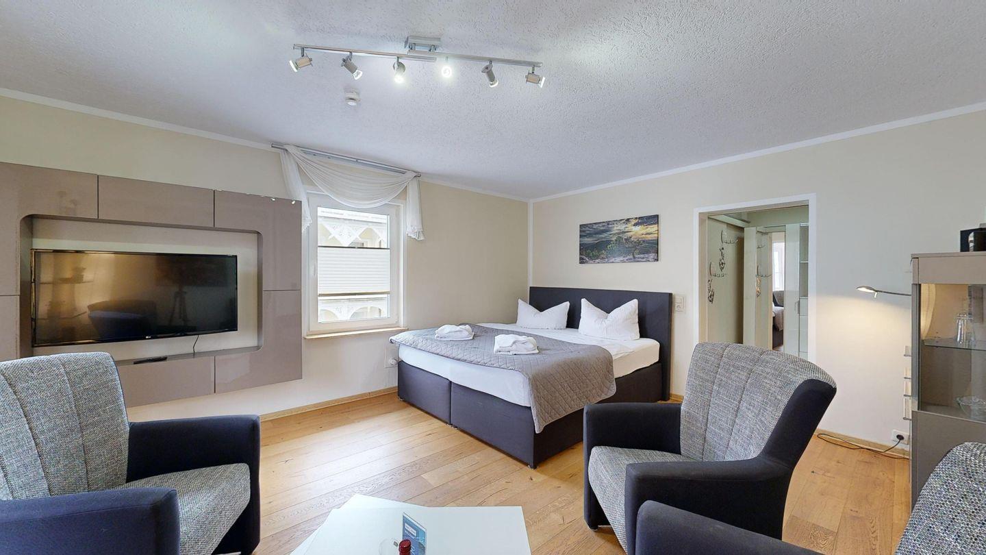 *1 Schlafzimmer mit einem Boxspringbett und TV
