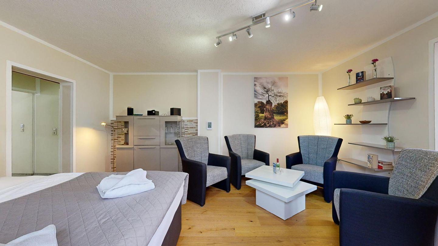 * Großes Wohn-/Schlafzimmer mit Echtholzpakett und Bodenheizung, 4 Sessel, Kabel-TV, WLAN-Internetanschluss und Zugang zur Loggia. Im Wohnzimmer gibt es ein Boxspringbett.