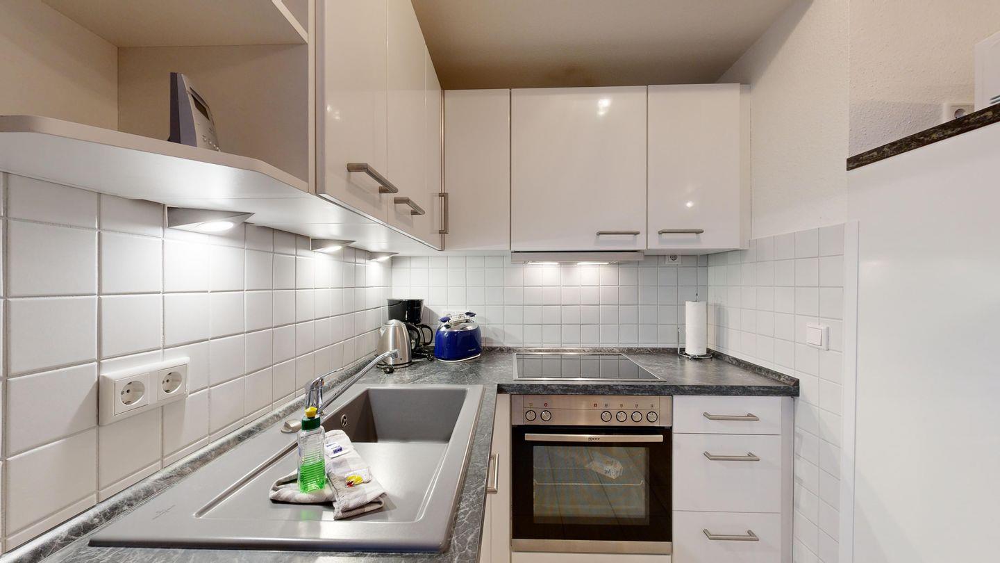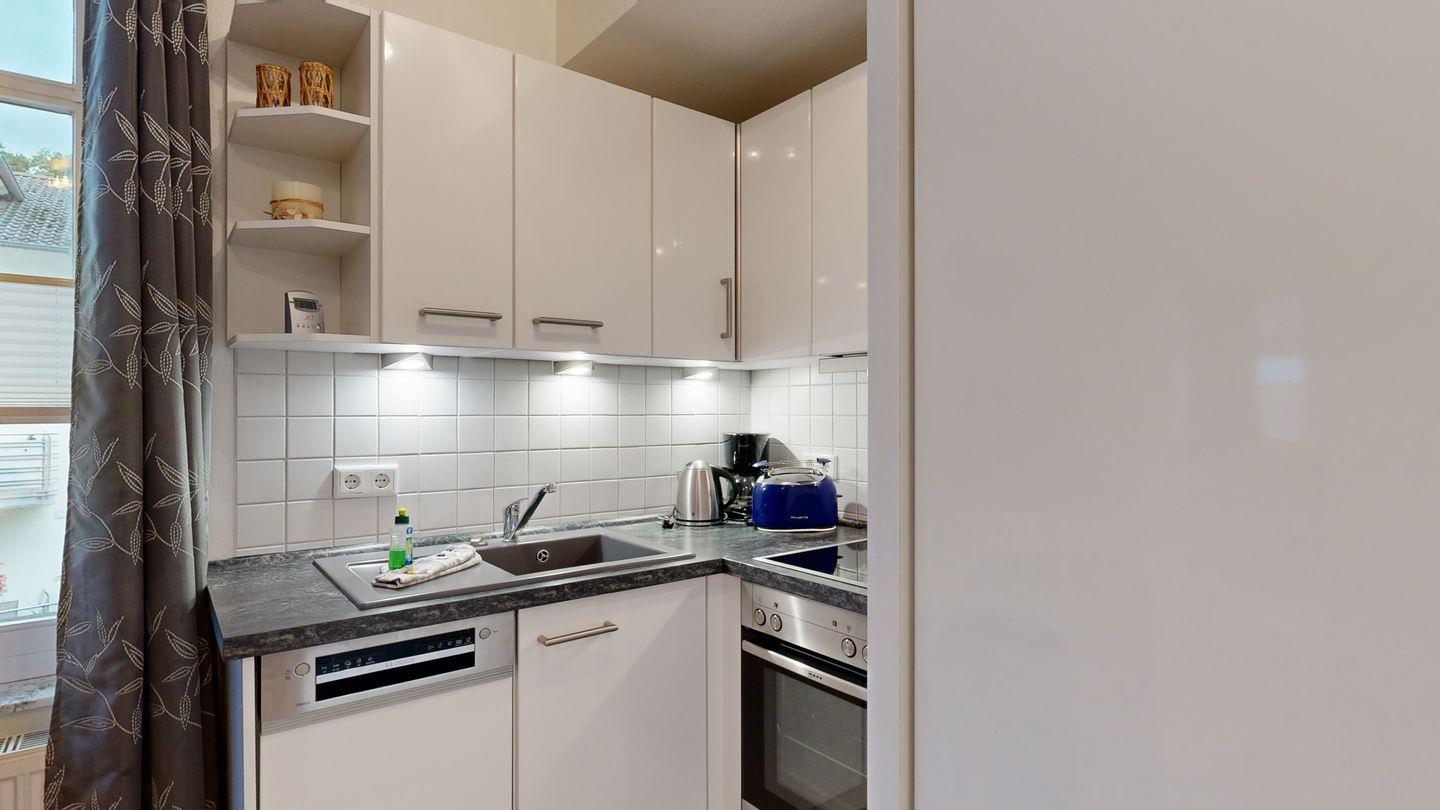 * Offene Küche: Moderne Küchennische mit Ceranherd, Spülmaschine, Mikrowelle, Backofen, Kühlschrank, Wasserkocher, Kaffeemaschine und Toaster