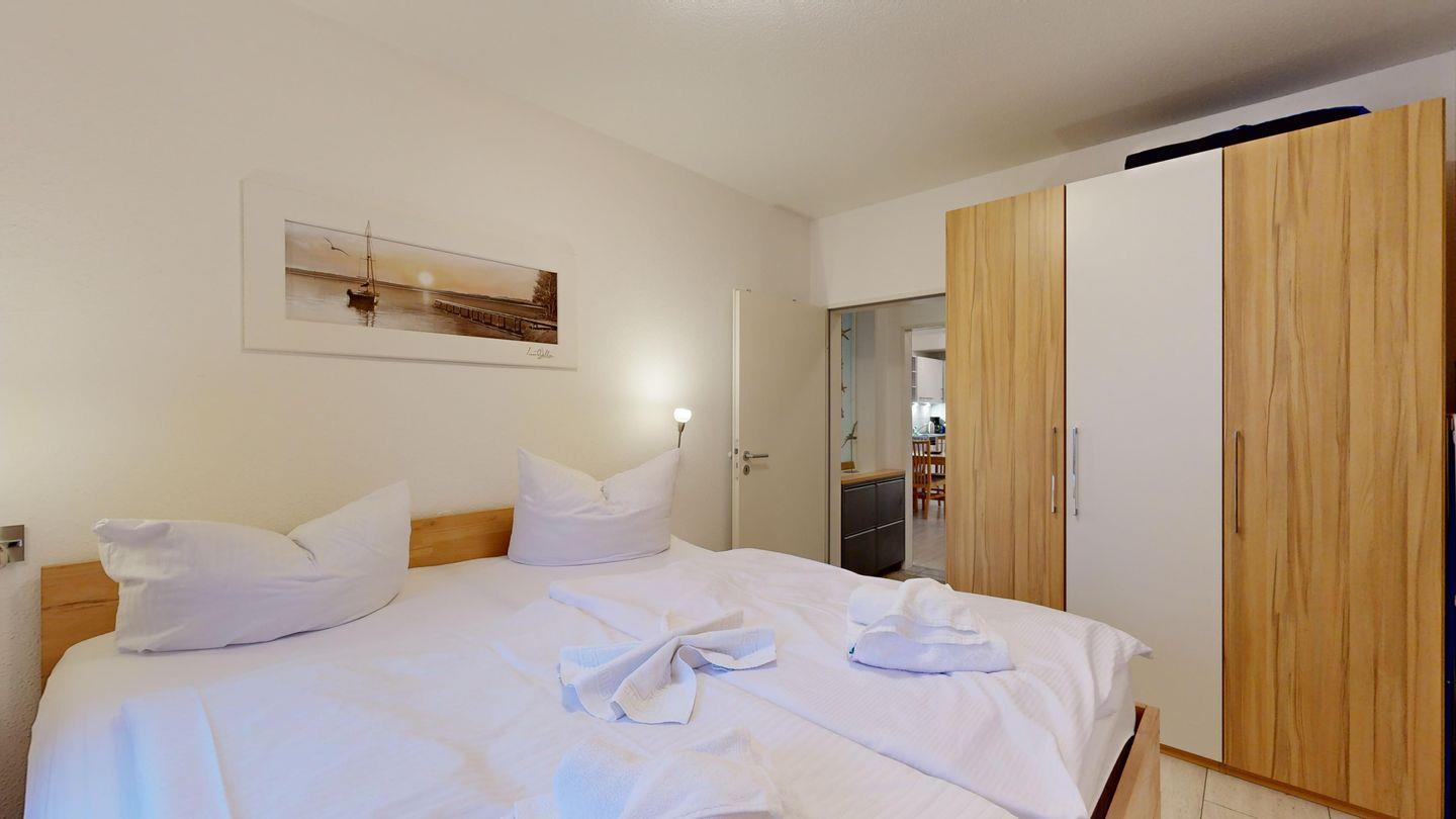 * 1 Schlafzimmer mit einem Doppelbett und Kleiderschrank