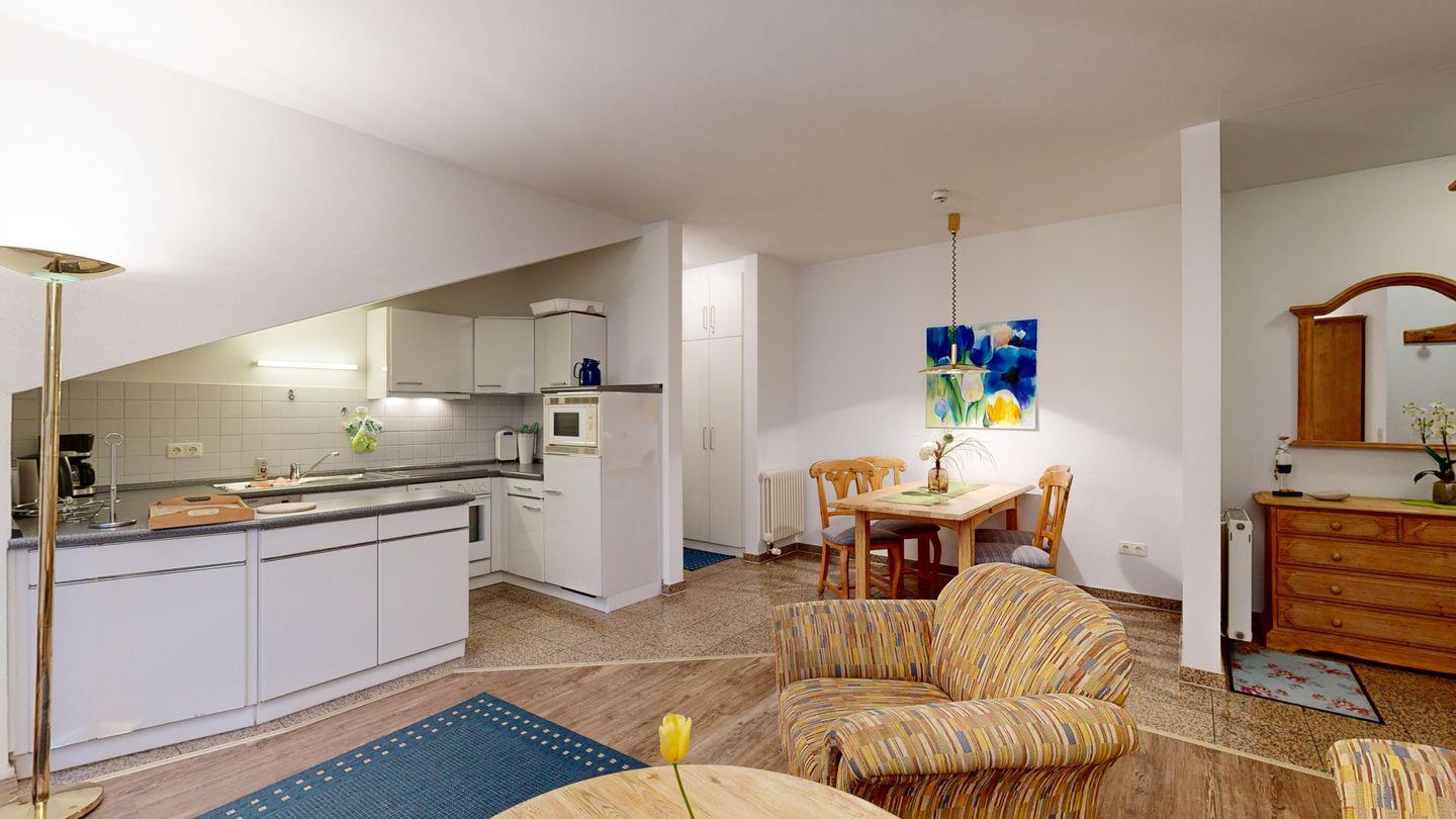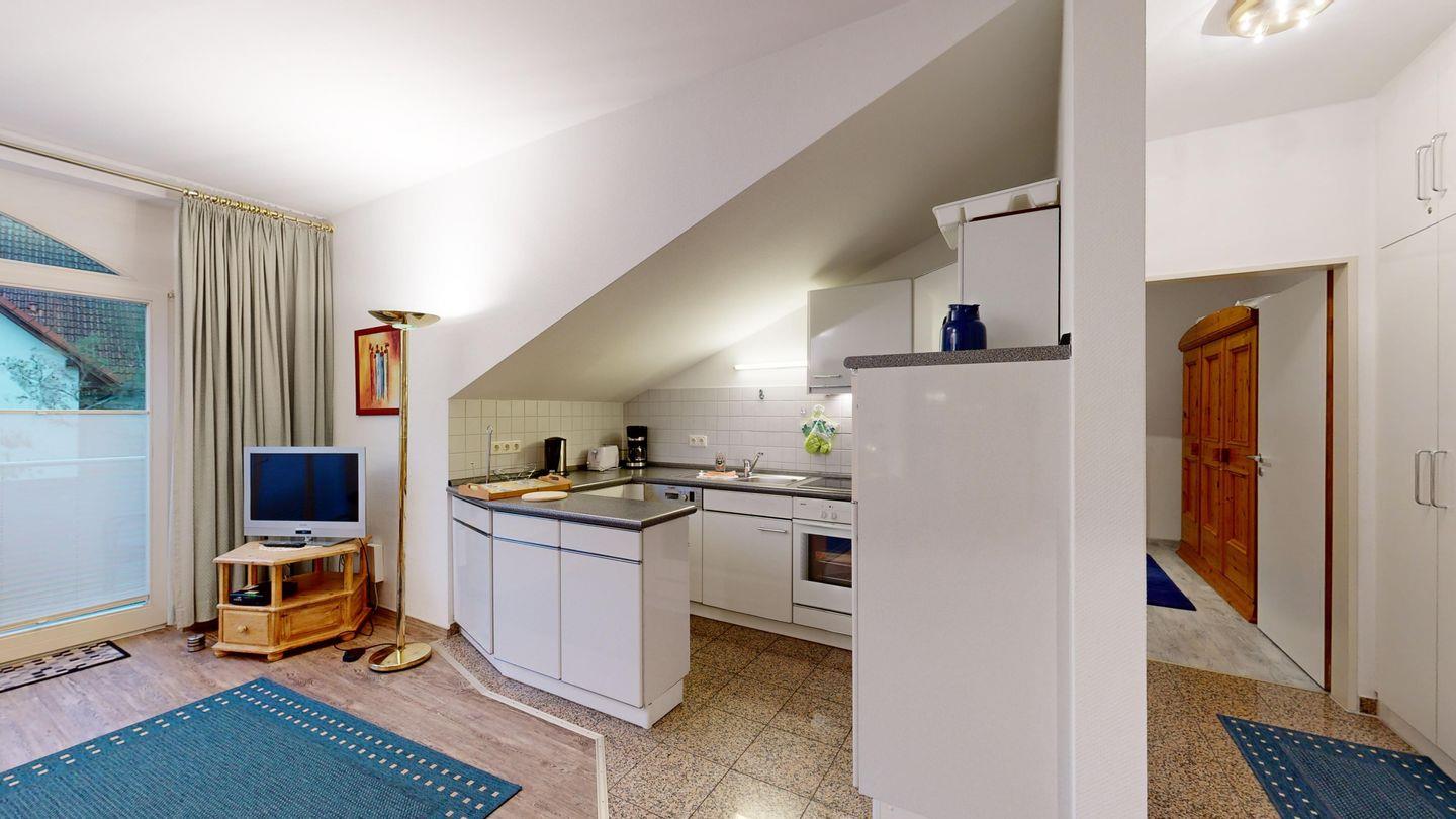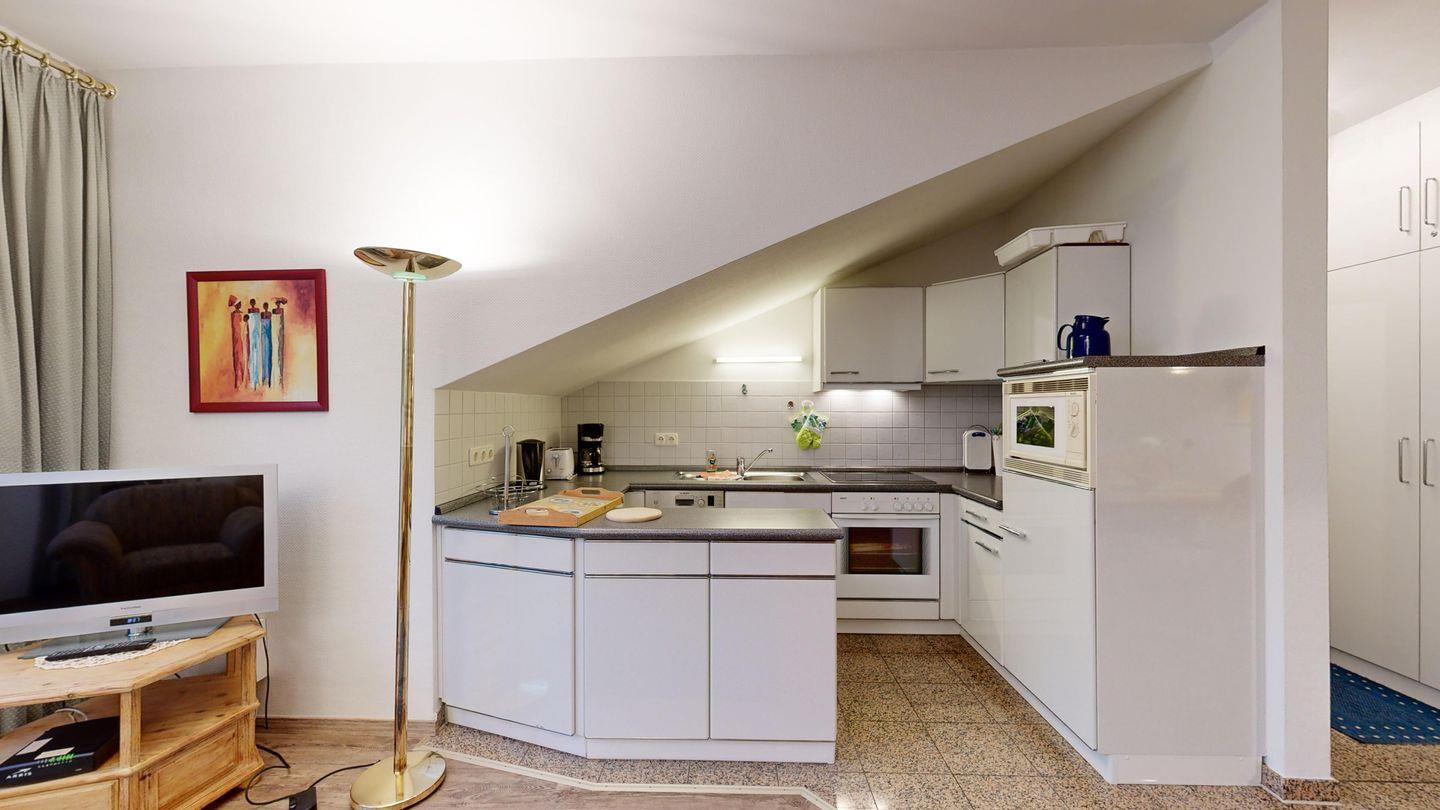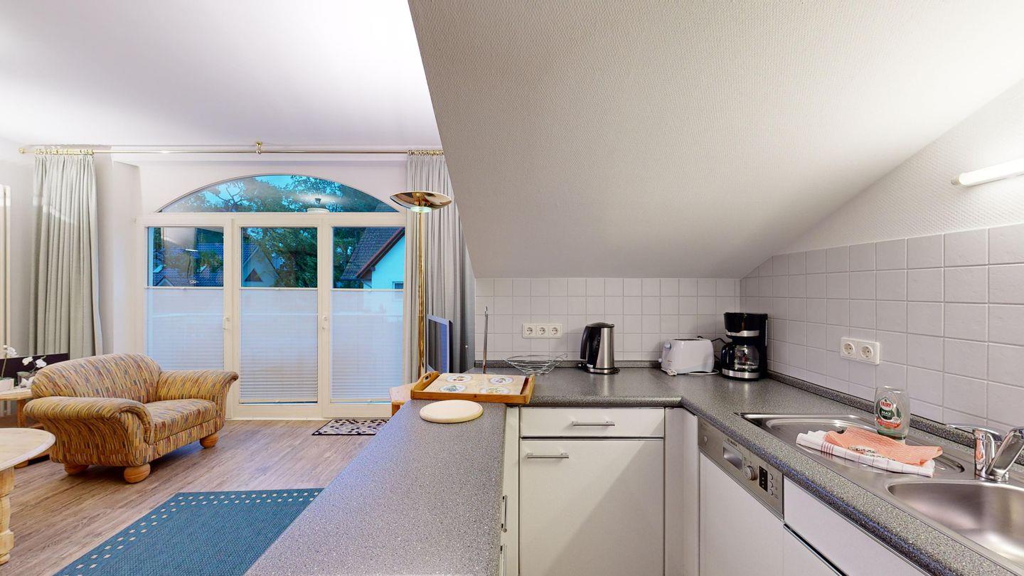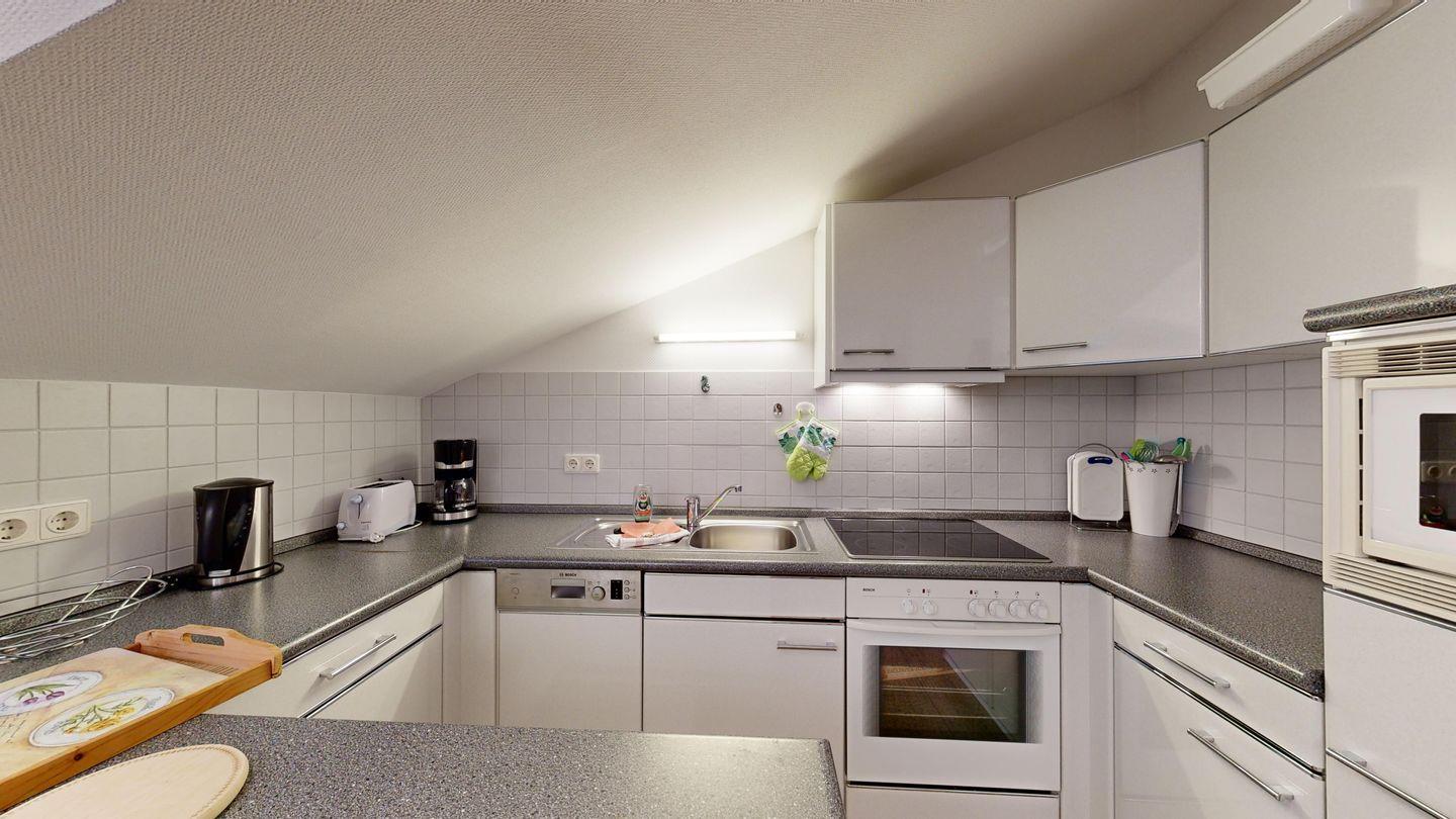 * Offene Küchennische, die im Wohnzimmer integriert ist, mit E-Herd und Backofen, Kühlschrank, Toaster, Spülmaschine, Mikrowelle und Kaffeemaschine