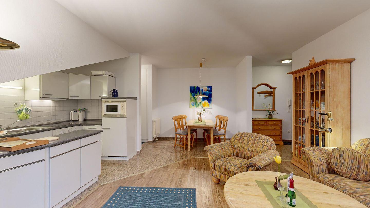 Familienzeit unter einem Dach: Zwei behagliche Schlafzimmer, viel Gemütlichkeit und die Strandnähe machen diese Wohnung zum idealen Rückzugsort. Und das Beste – bei jedem Wetter warten Sauna und Schwimmbad direkt im Haus.