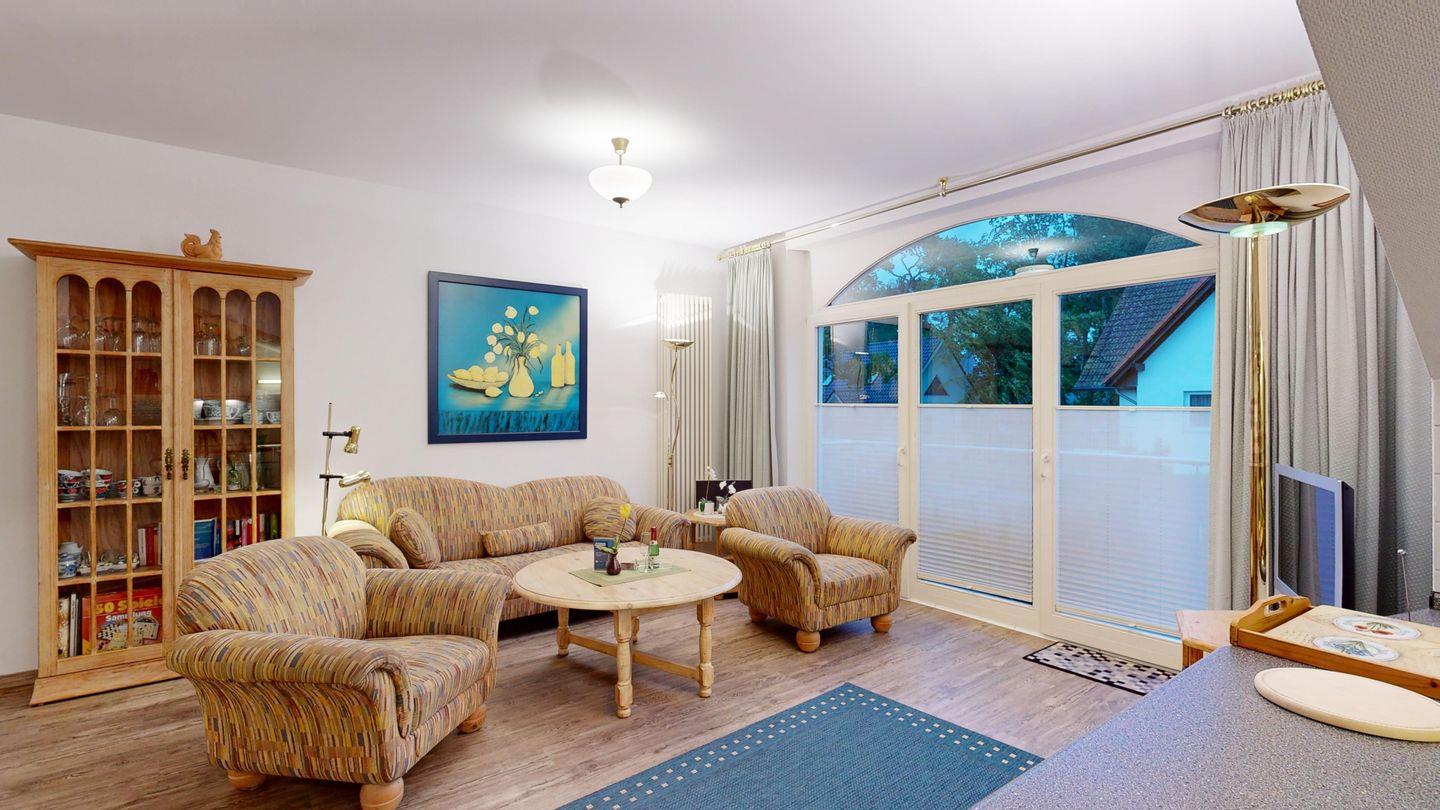 * Wohnzimmer: Couchgarnitur und 2 Sessel, Kabel-TV, Essplatz, WLAN und Zugang zum Balkon