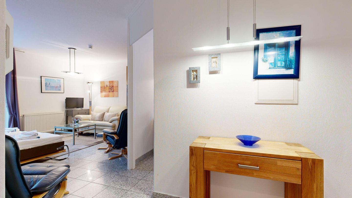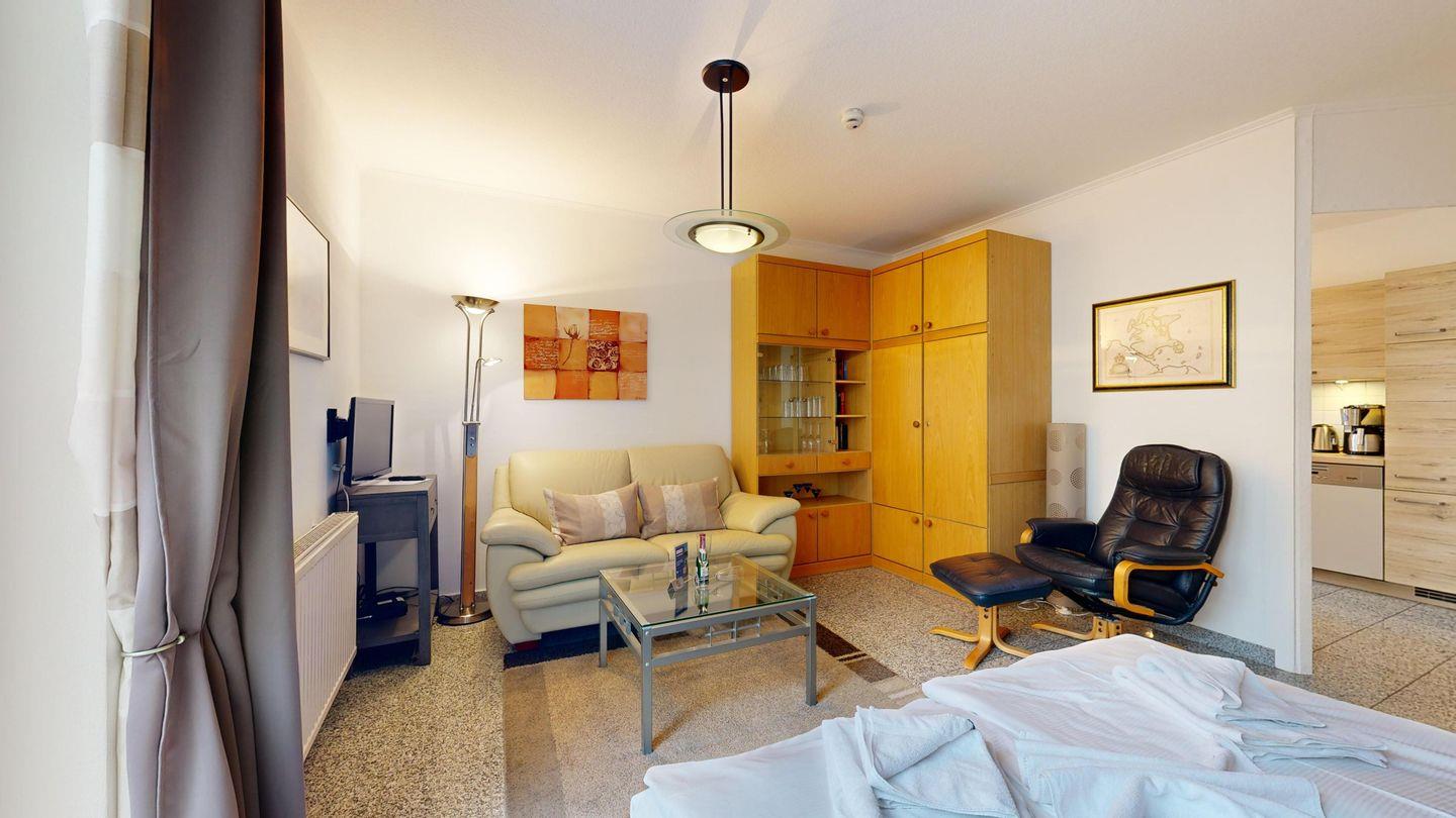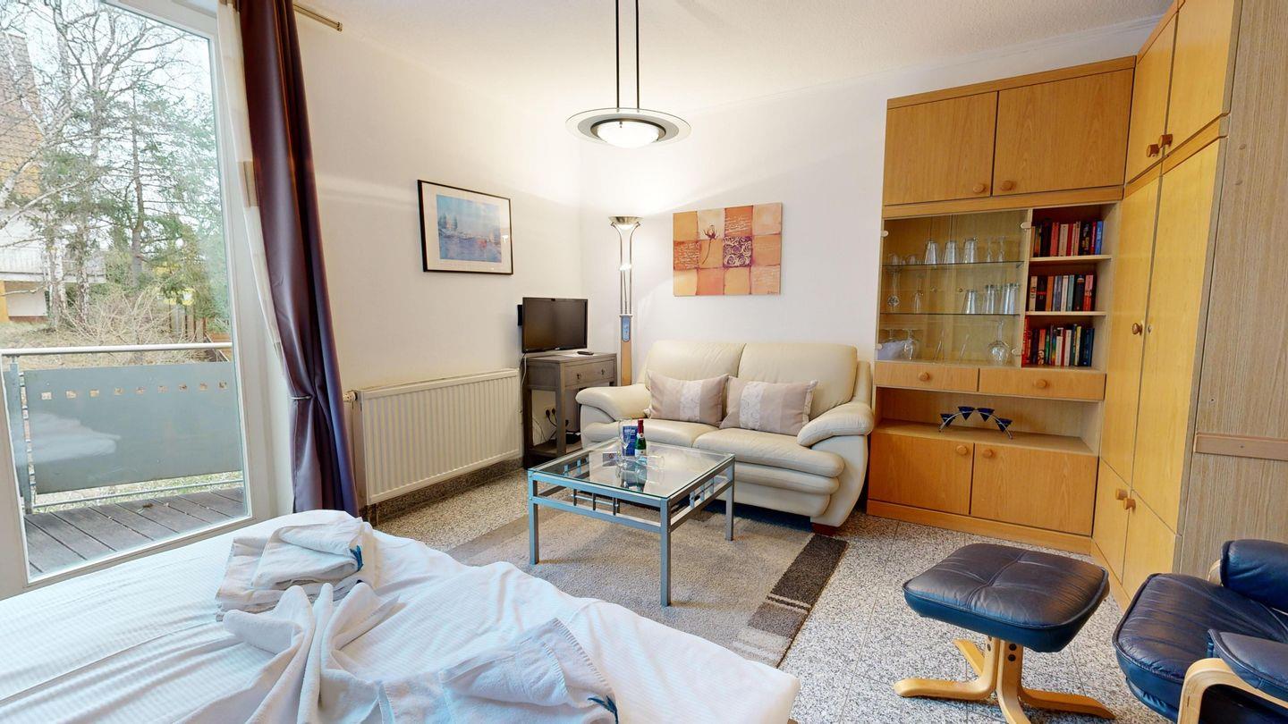 Charmantes Einraumappartement im Ostseebad Binz mit Schwimmbad, Sauna, Balkon und Tiefgarage, nur wenige Schritte vom Strand entfernt.