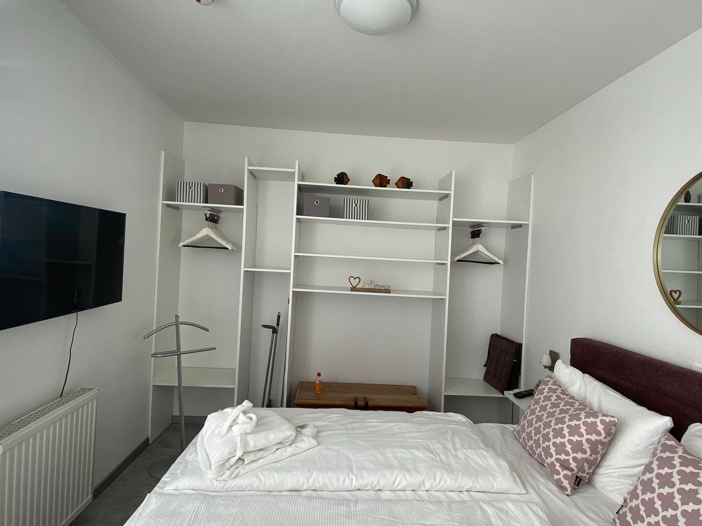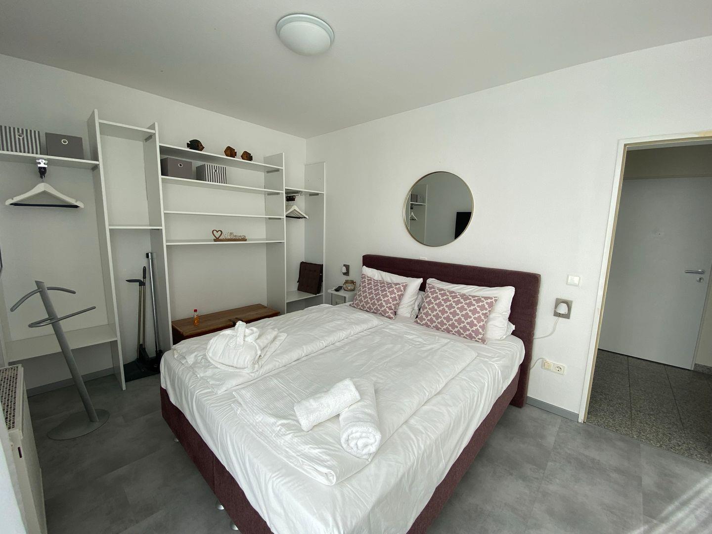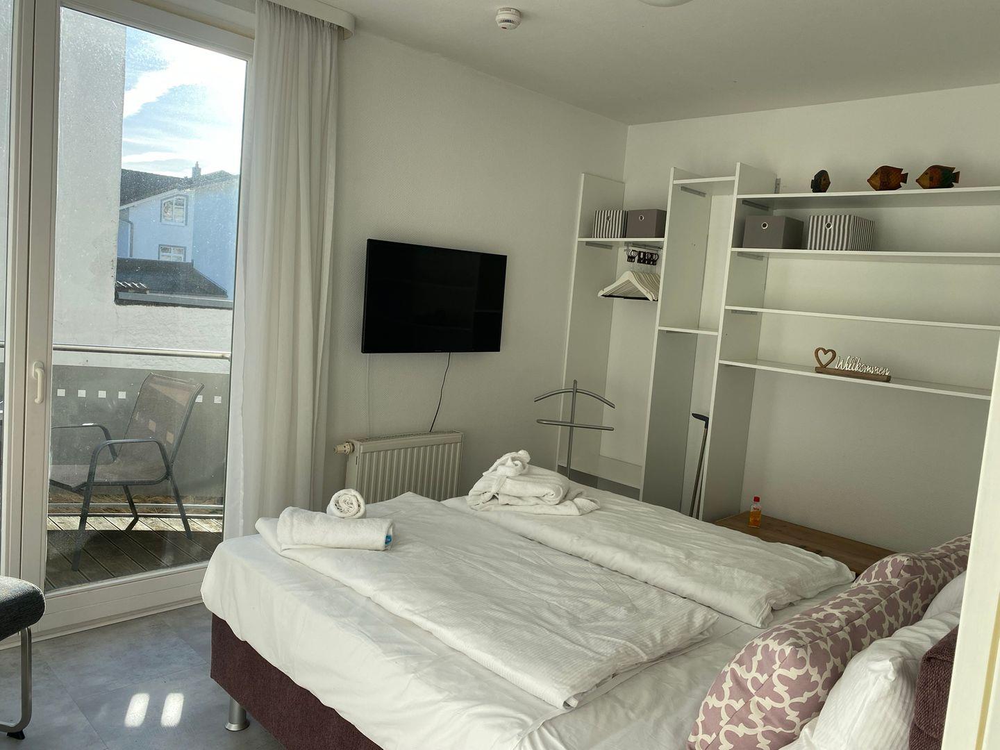 * 1 Schlafzimmer mit einem Doppelbett, TV und Zugang zum Balkon