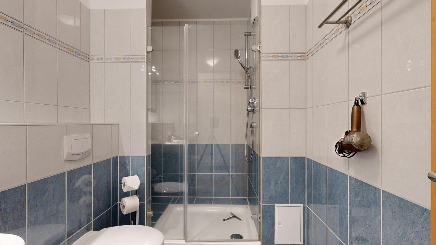 * Badezimmer mit großer Dusche, Föhn und WC