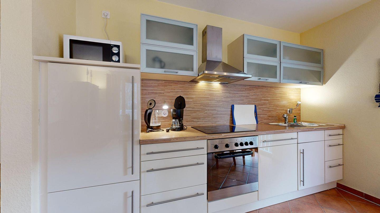 * Küche: Moderne Küchenzeile mit E-Herd mit Backofen, Spülmaschine, Mikrowelle, Wasserkocher, Kaffeemaschine und Toaster