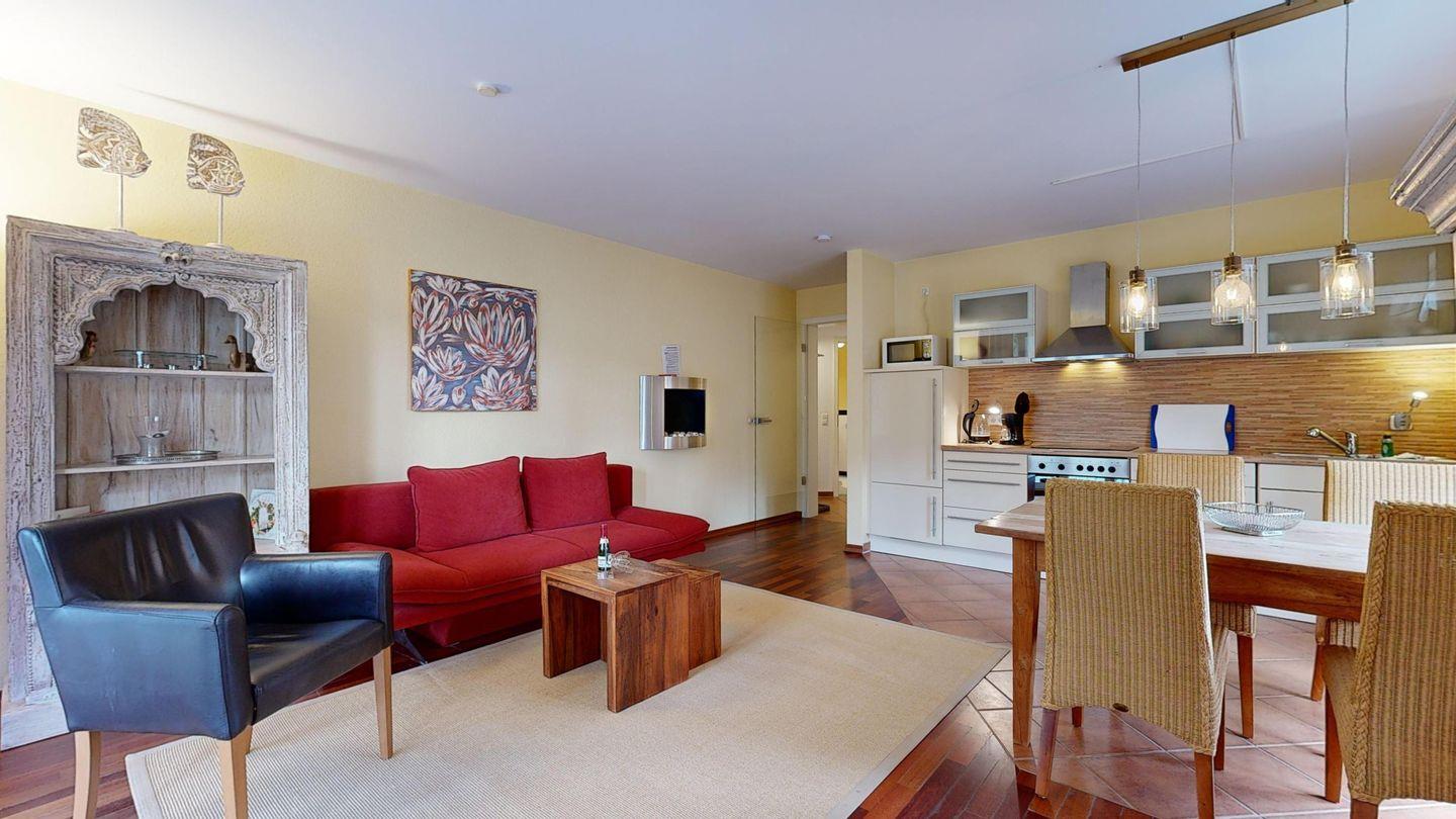 * Wohnzimmer: Kabel-TV, DVD-Player, Stereoanlage, Kamin (Edelstahl-Wandkamin), der mit Bio-Ethanol betrieben wird, WLAN-Internetanschluss und Essplatz