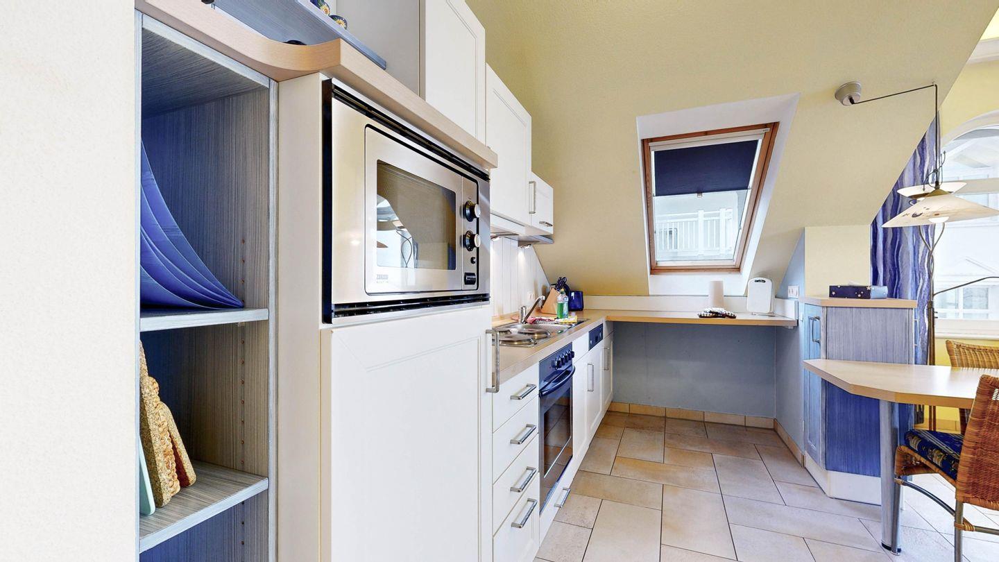 * Küche: Moderne Küchenzeile mit Spülmaschine, E-Herd mit Backofen, Mikrowelle, Essplatz, Wasserkocher, Kaffeemaschine, Toaster