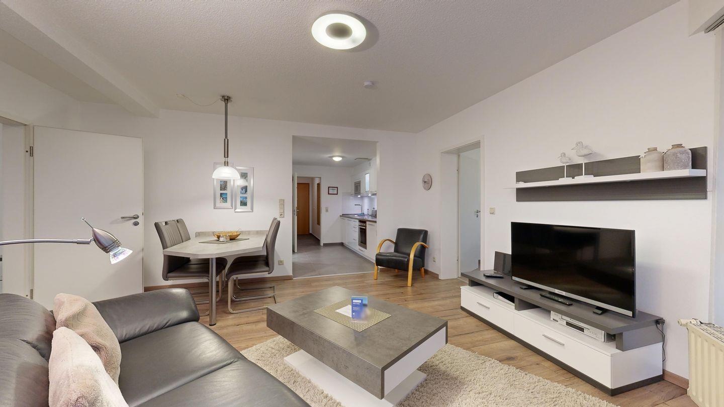 * Wohnzimmer: Ledercouchgarnitur, Essplatz, Kabel-TV (Flachbildschirm) und Internetzugang (WLAN oder Kabel möglich)