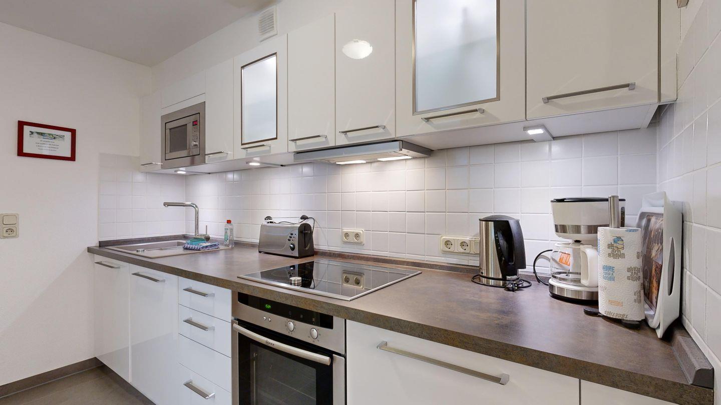* Küche: Moderne Küchenzeile, Induktionsherd, Spülmaschine, Backofen, Mikrowelle, Wasserkocher, Kaffeemaschine und Toaster