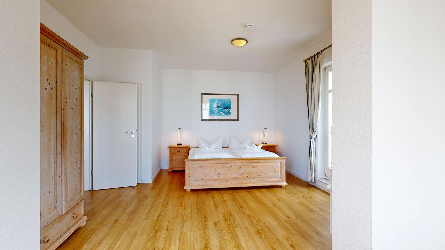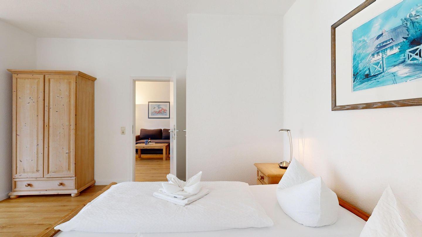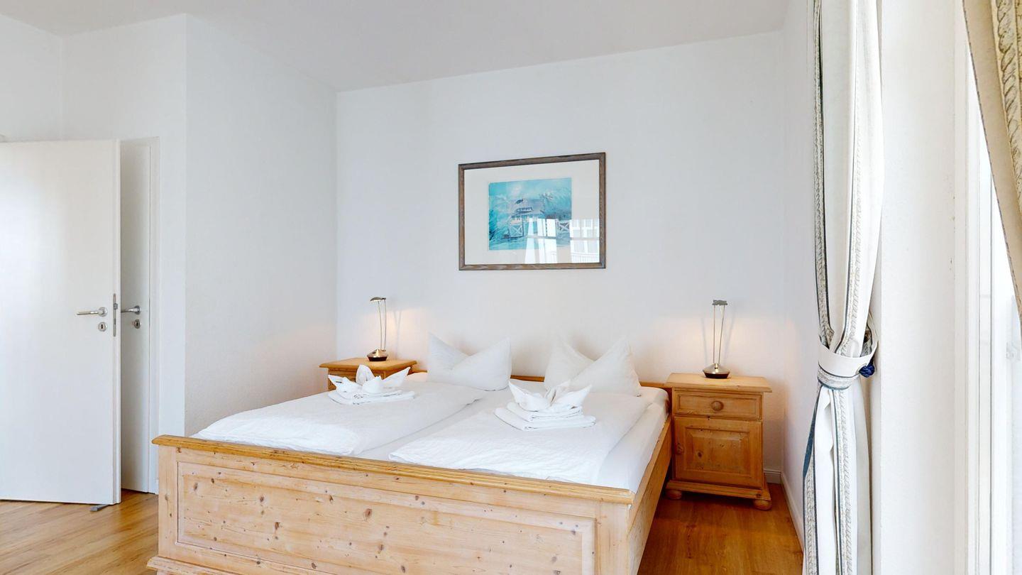 * 1 Schlafzimmer mit einem Doppelbett, 2 Korbsessel und Tisch