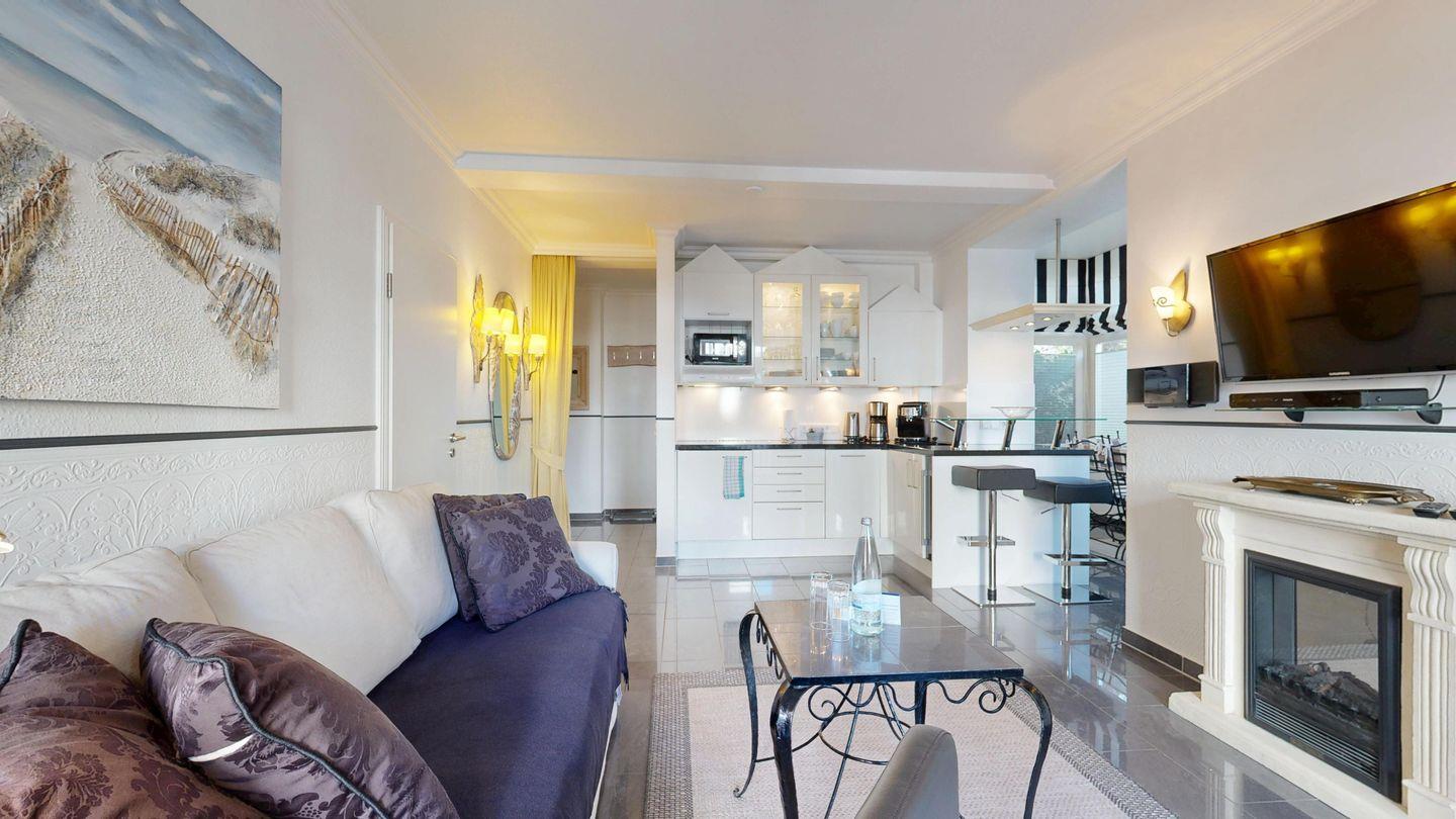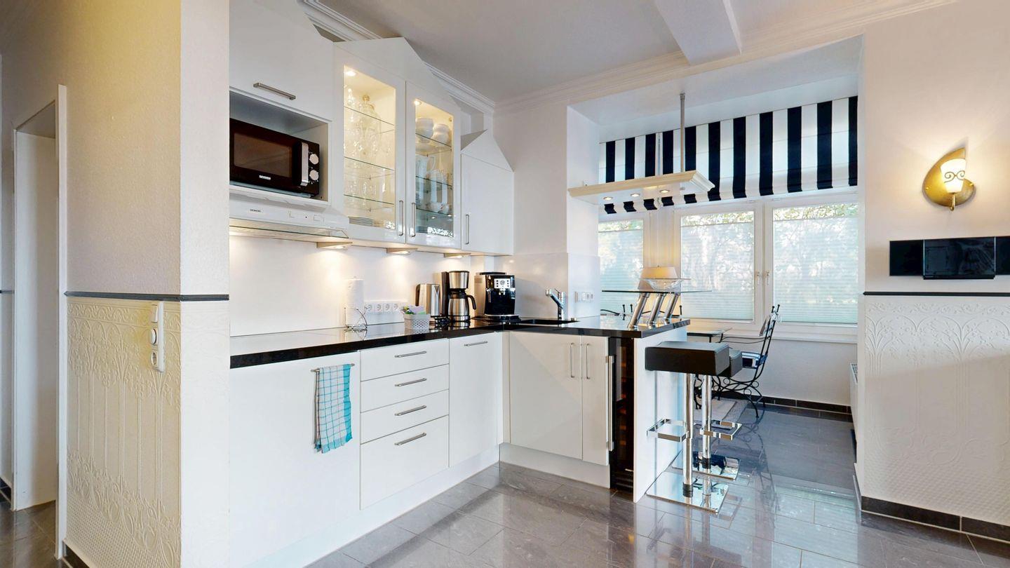 * offene Küche mit E-Herd, Spülmaschine, Mikrowelle, Kaffeemaschine und Wasserkocher