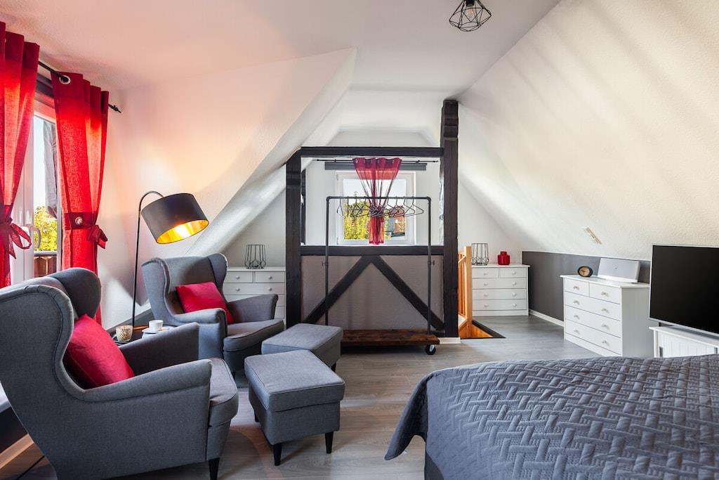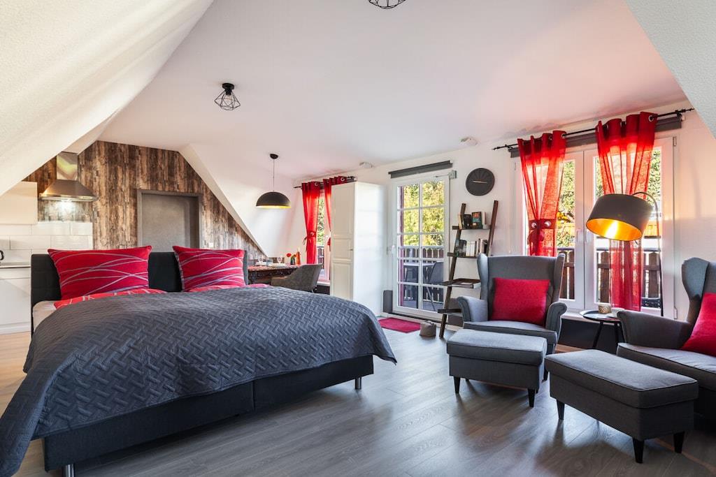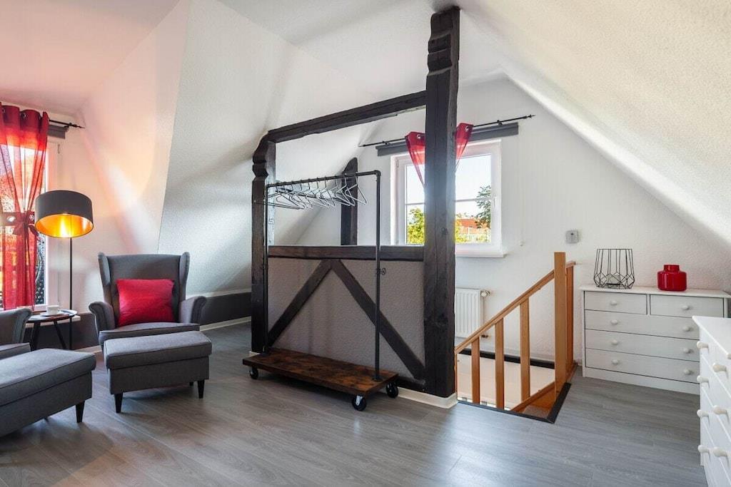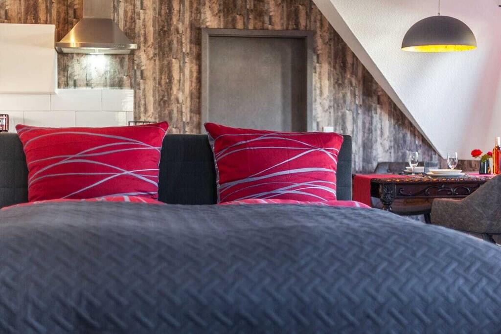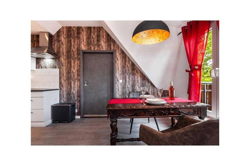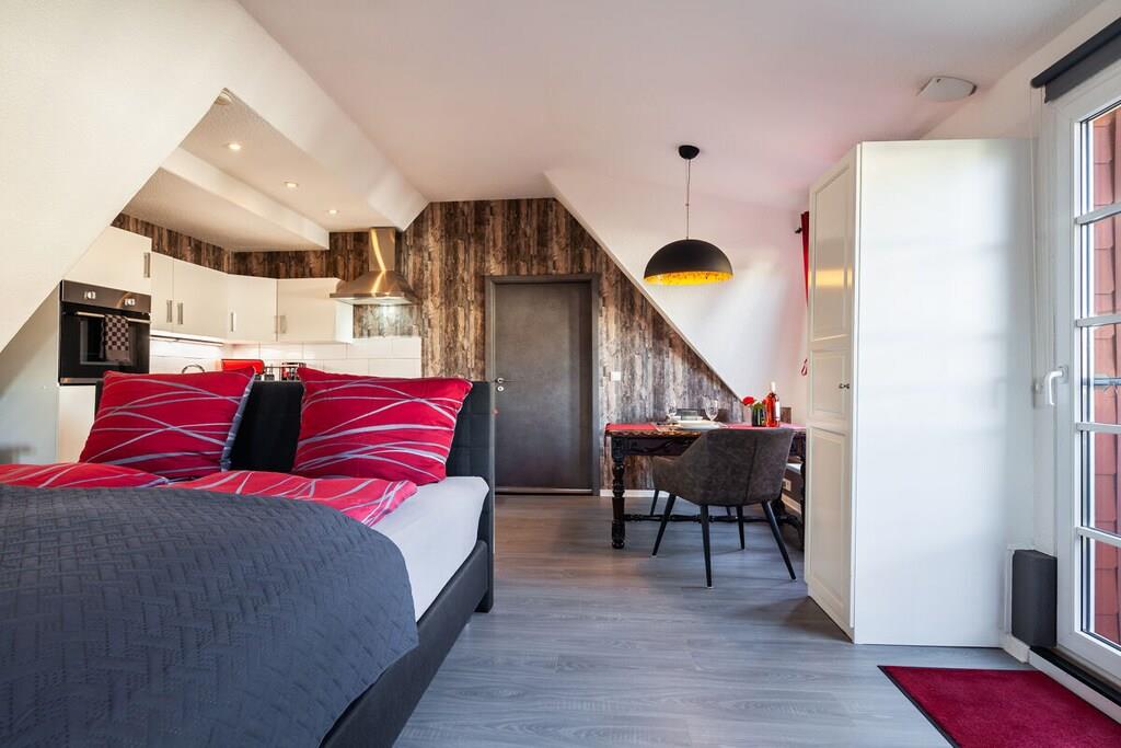 Unsere Ferienwohnung ist eine gemütliche 1-Zimmer-Wohnung mit Balkon im 1.OG für bis zu 2 Personen. Der Wohnbereich ist mit Laminat ausgelegt und bietet im komfortablen Boxspringbett für 2 Personen Platz (180x200 cm). Die voll ausgestattete Küche ist in den Wohnbereich integriert. Hier finden Sie neben dem Kühlschrank mit 1 Gefrierfach, 1 Herd mit Backofen , 1 Mikrowelle und 1 Geschirrspüler. Selbstverständlich gehört auch ein separates Duschbad zur Ferienwohnung. Ein Parkplatz auf unserem Grundstück sorgt für die sichere Unterbringung Ihres Autos. Auch mitgebrachte Fahrräder z.B. E-Bikes können bei uns sicher im überdachten Fahrradunterstand untergestellt werden.