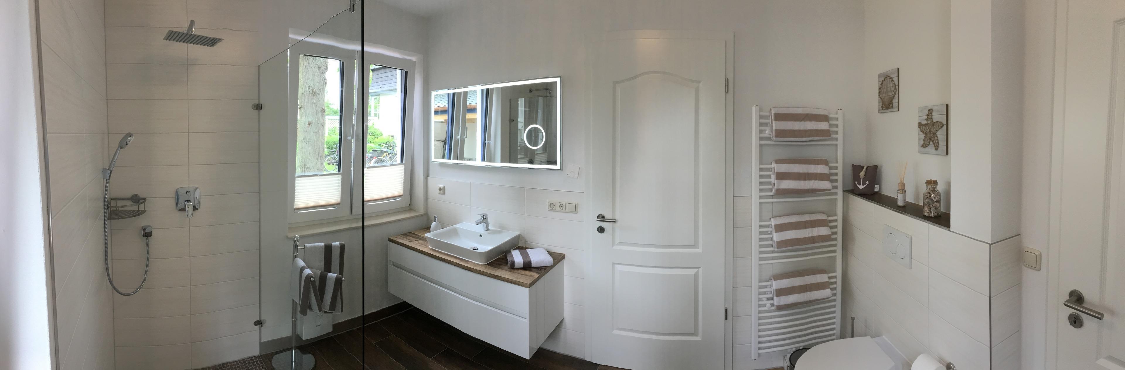 Das moderne Bad verfügt über eine ebenerdige Regendusche.