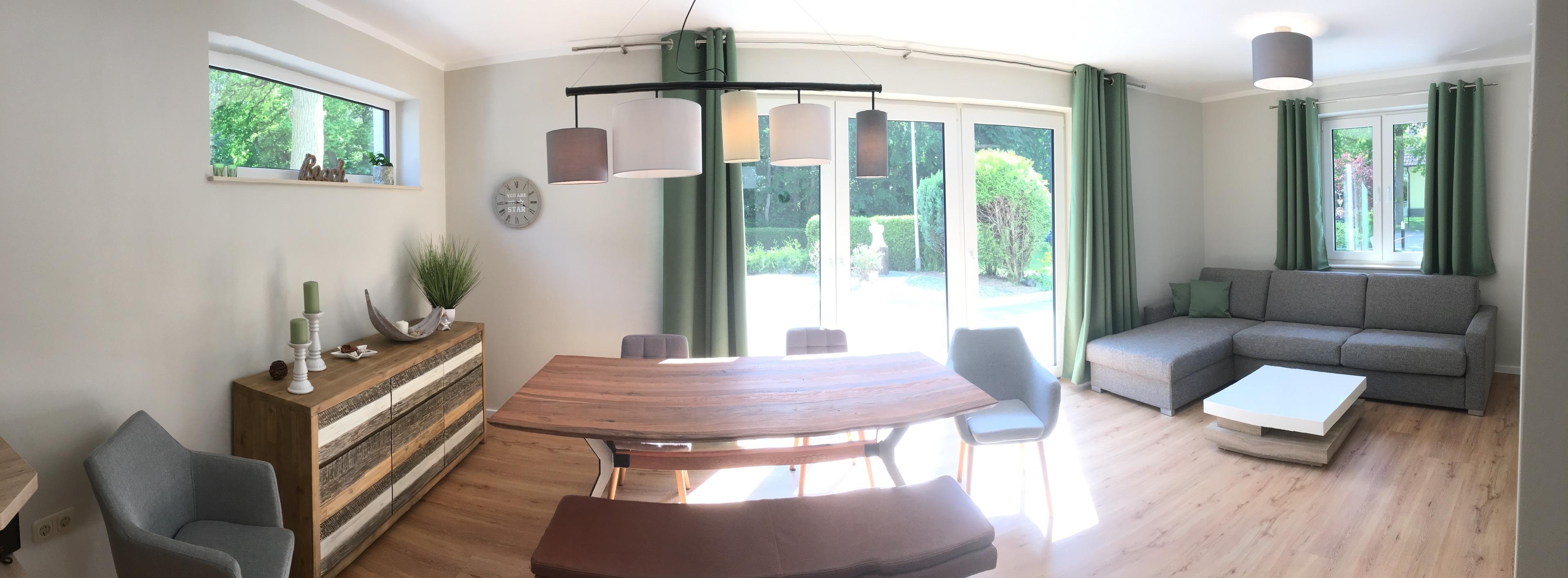 Wir haben die Ferienwohnung Barrierefrei gestaltet und Allergikerfreundlich eingerichtet. Sie besteht aus einem großzügigen offenen Wohn- und Küchenbereich mit gemütlicher Couchlandschaft, Flachbildfernseher, Musikanlage, Kamin, Essbereich und einer modernen komplett eingerichteten Küche. Vom Wohnzimmer aus, gelangen Sie ebenerdig auf die nach Süden ausgerichtete Sonnenterrasse.