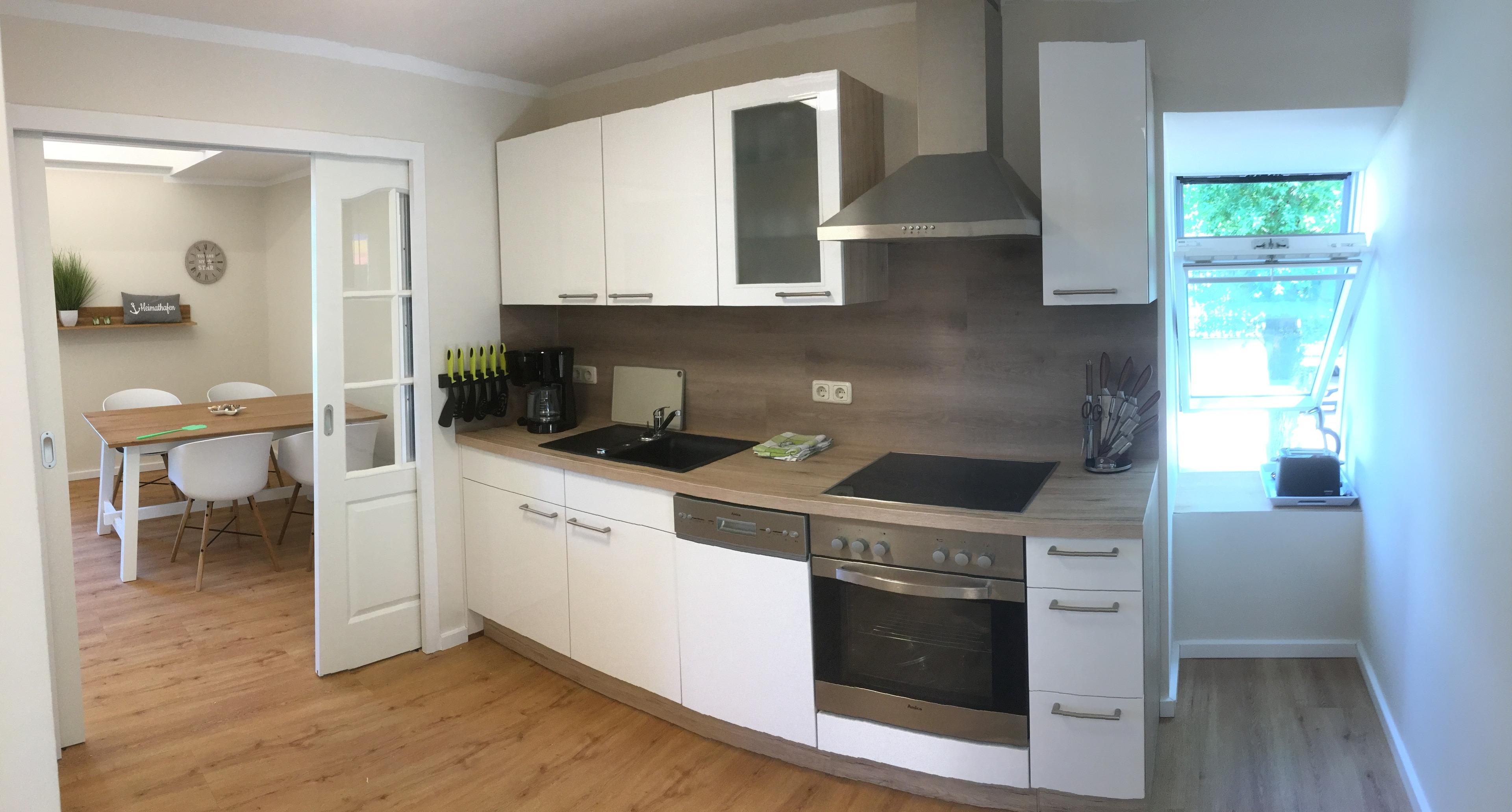 Wir haben die Ferienwohnung maritim gestaltet und Allergikerfreundlich eingerichtet. Sie besteht aus einem Wohnbereich mit gemütlicher Couchlandschaft, Flachbildfernseher, Musikanlage, Essbereich und einer modernen komplett eingerichteten Küche. Die Couchlandschaft dient gleichzeitig als Schlafplatz für 2 Personen. Durch die eingebaute Matratze und das Lattenrost verfügt sie über den Comfort eines vollwertigen Doppelbetts.