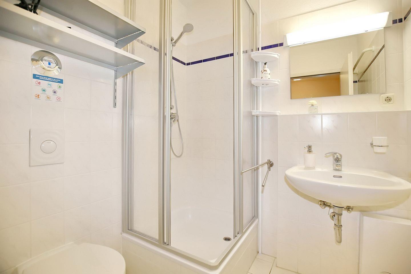 Im gefliesten Duschbad kannst du für deine Utensilien ein kleines Regal nutzen. Auch ein Föhn liegt bereit. In diesem Objekt sind Haustiere erlaubt.