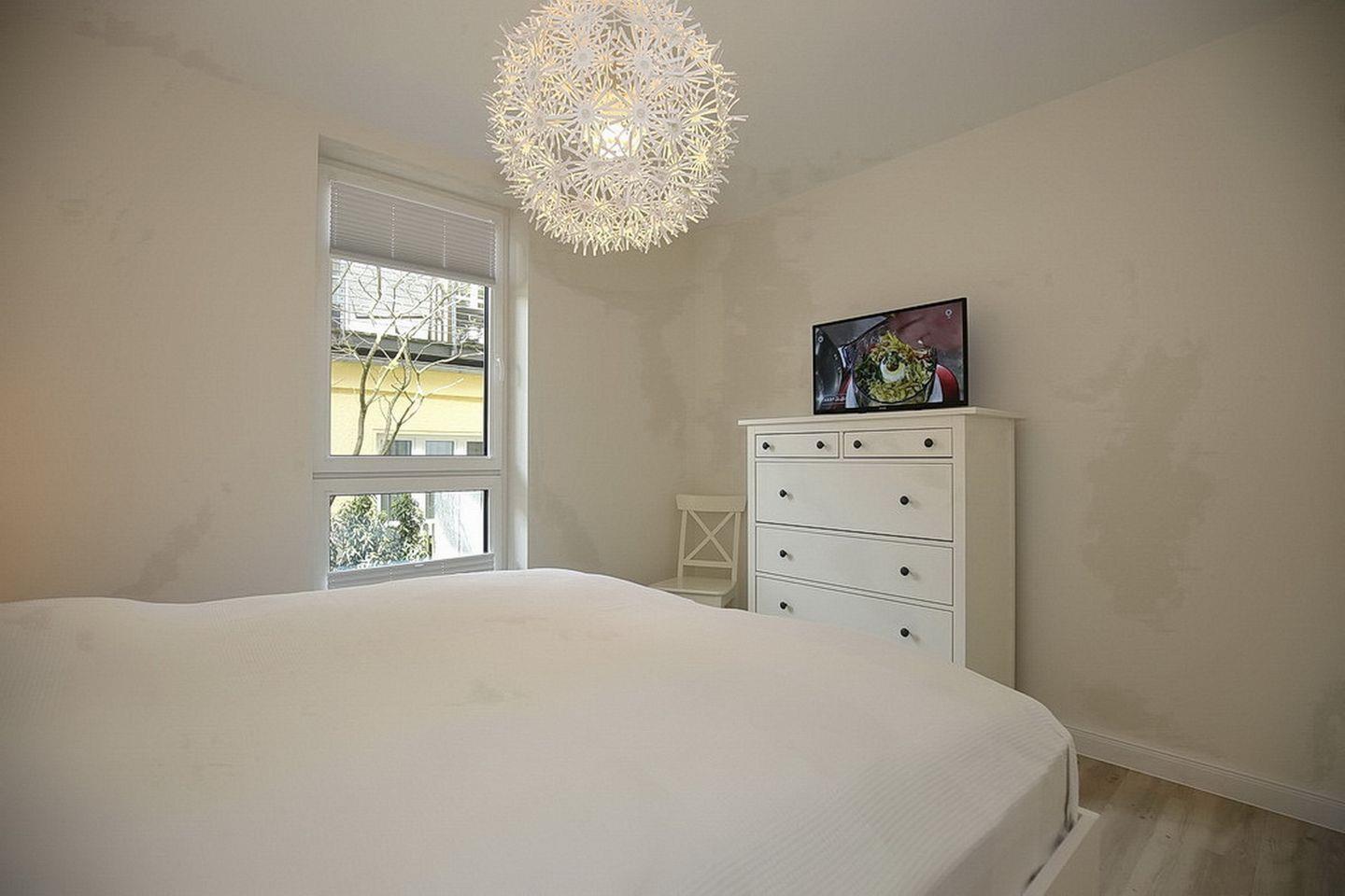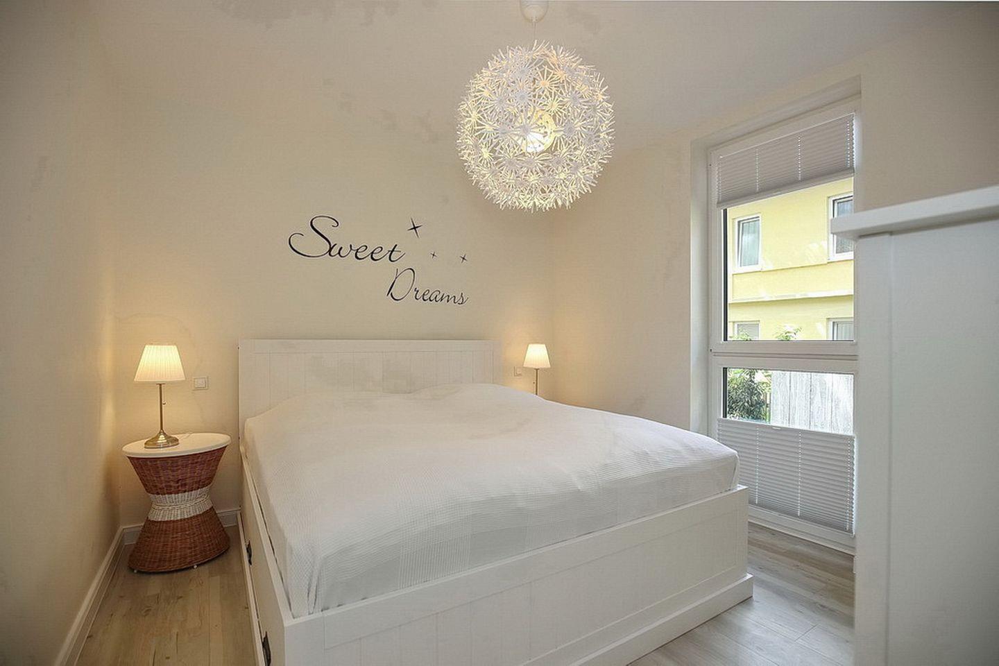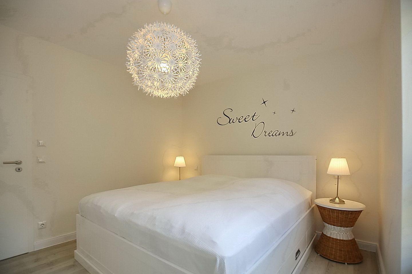 Das Schlafzimmer erreichst du über den Flur. Hier wartet ein bequemes Doppelbett (2 x 90 x 200 cm) auf erholsamen Schlaf. Deine Urlaubsgarderobe findet im geräumigen Kleiderschrank ausreichend Platz. Ein zweiter Flachbildfernseher steht zur Verfügung. Auch hier können die Fenster mit Plissees verdunkelt werden.