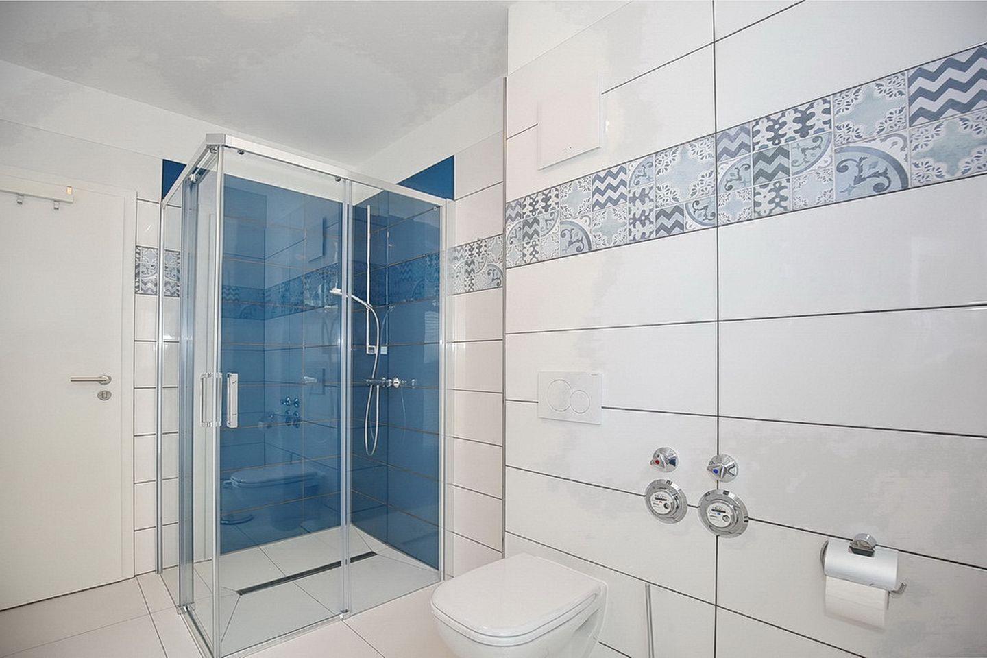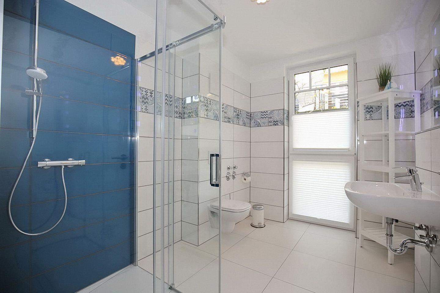 Das stilvolle Bad ist hell gefliest und mit einem Waschtisch, einer bodengleichen Dusche, einem WC sowie einem Handtuchheizkörper ausgestattet. Zusätzlich gibt es ein Gäste-WC.