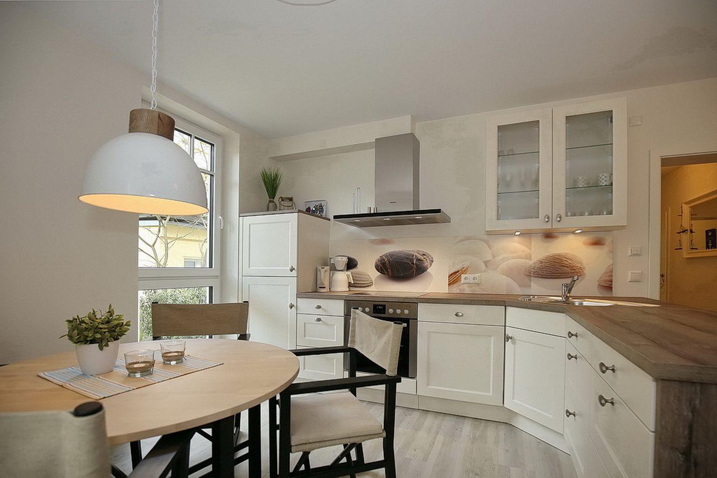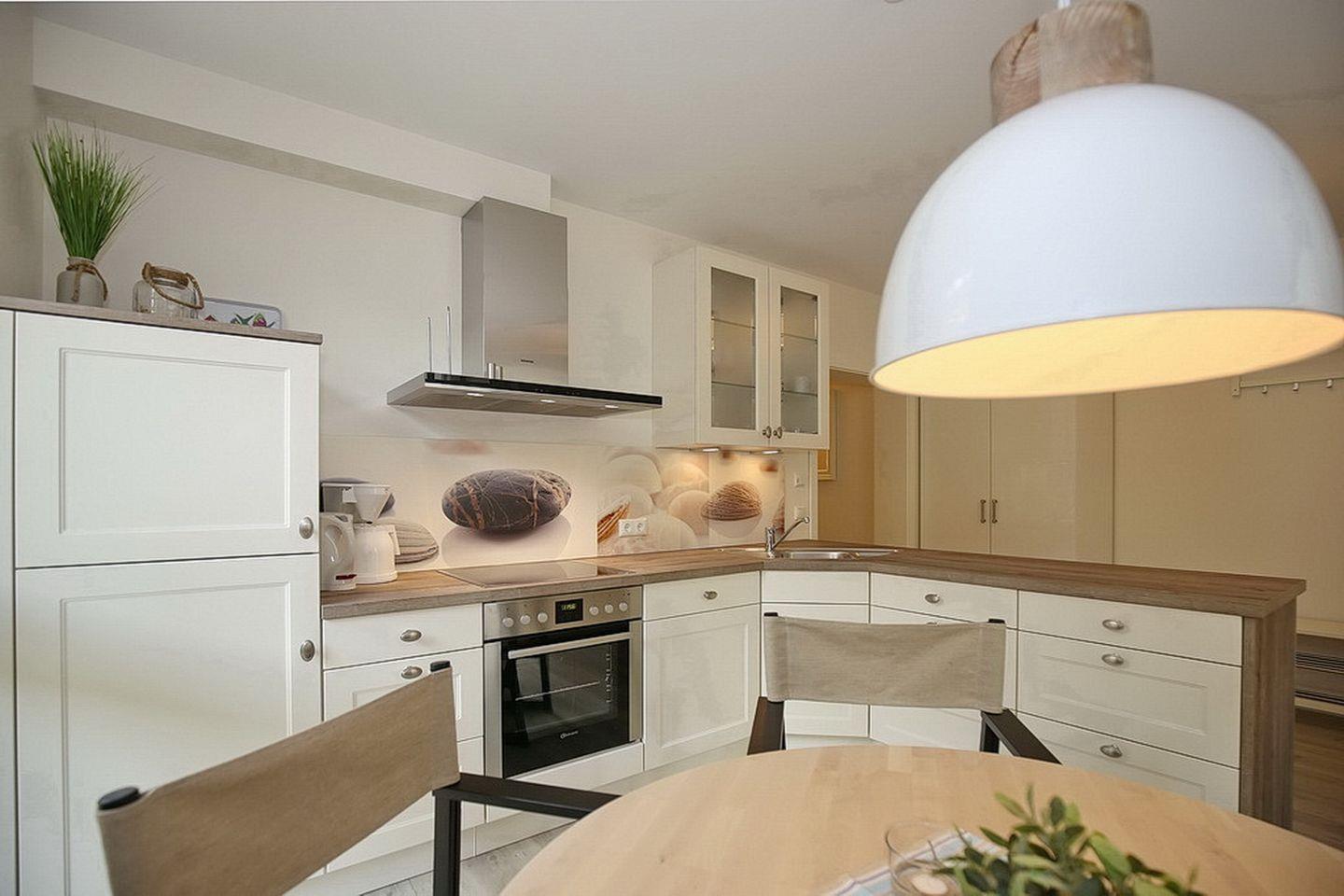 Direkt vom Hausflur aus gelangst du in die moderne Küche, die komplett ausgestattet ist für die Zubereitung von Mahlzeiten. Ein Herd mit 4 Cerankochfeldern und Backofen, ein Kühlschrank mit Gefrierfach, eine Geschirrspülmaschine sowie ausreichend Geschirr und Gläser stehen zur Verfügung. Die Mahlzeiten können an einer gemütlichen Essecke eingenommen werden. Vom Flur aus gelangst du auf den Südbalkon, auf dem du die Nachmittagssonne genießen kannst. Hier kannst du auch den vorhandenen Elektrogrill (Tischgrill) nutzen.