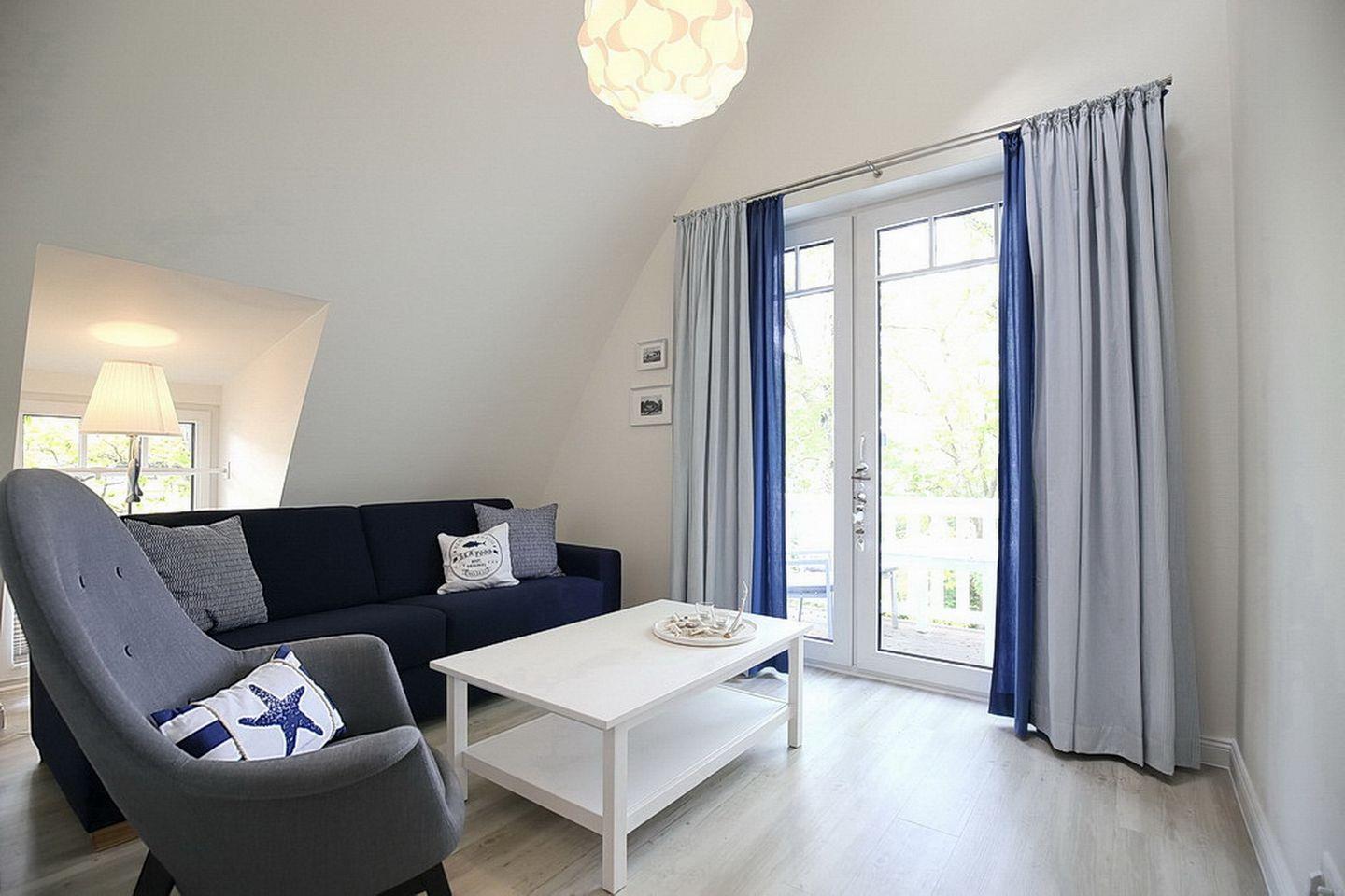 Die liebevolle Einrichtung sorgt im Wohnzimmer für eine gemütliche Atmosphäre. Bodentiefe Fensterelemente bieten dir ein großzügiges Wohngefühl. Eine ausklappbare, bequeme Schlafcouch (180 x 200 cm) bietet Platz für 2 Personen zum Schlafen. Selbstverständlich ist ein Flachbildfernseher vorhanden. Als Verdunklung dienen Vorhänge. Vom Wohnzimmer aus gelangst du auf den Balkon, der zur Seeseite ausgerichtet ist.