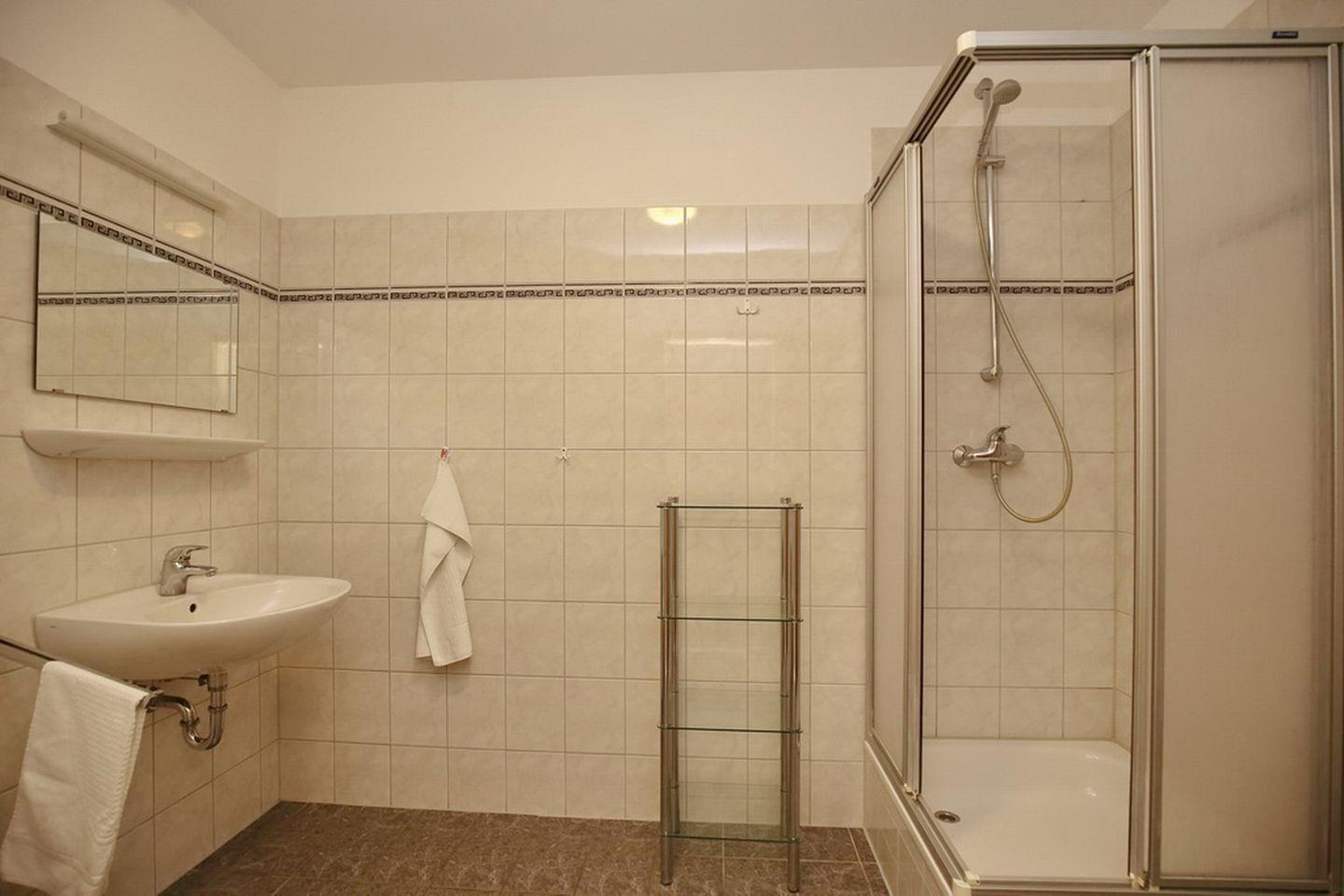 Im modernen, gefliesten Duschbad kannst du die Seele baumeln lassen. Der Boden in deiner Ferienwohnung ist mit Designbelag ausgelegt.