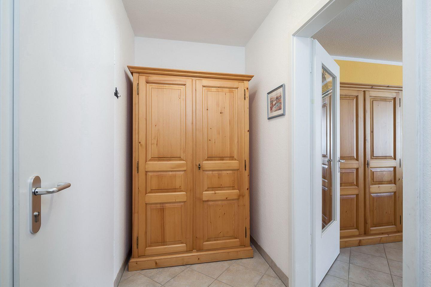 Einen ruhigen Schlaf finden Sie im Schlafzimmer mit Doppelbett (2 x 90 x 200 cm) und Vorhängen an den Fenstern. Die Urlaubsgarderobe kann im Kleiderschrank auf dem Flur oder im Wohnbereich verstaut werden.