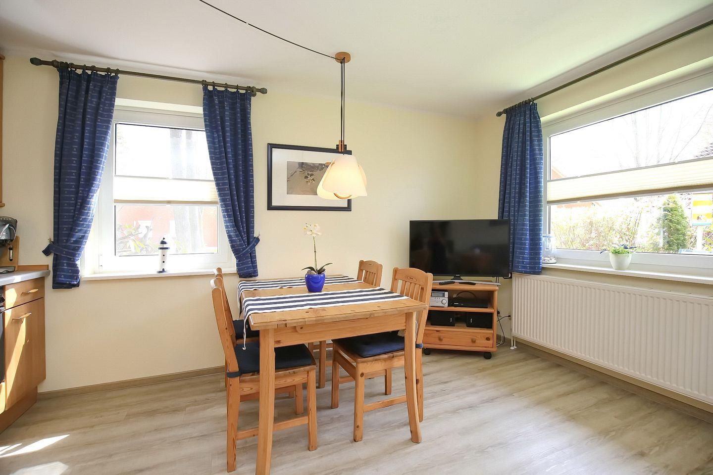 Die Küchenzeile ist mit Spülmaschine, Mikrowelle und einem 4-Platten-Cerankochfeld mit Backofen ausgestattet. Ein gemütlicher Essplatz befindet sich in unmittelbarer Nähe der Küchenzeile. Selbstverständlich hat dieses Ferienhaus ein Duschbad inklusive Waschmaschine.