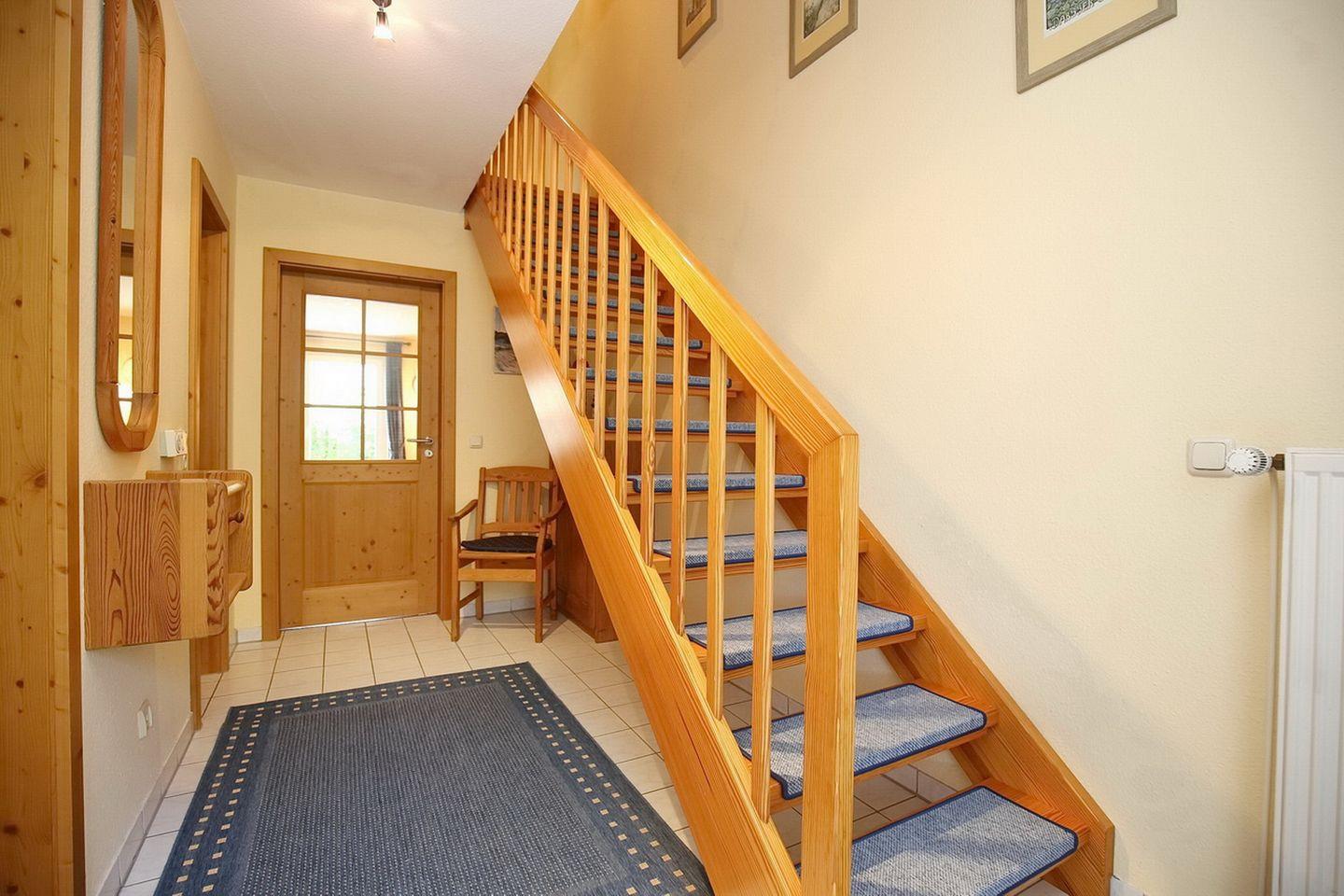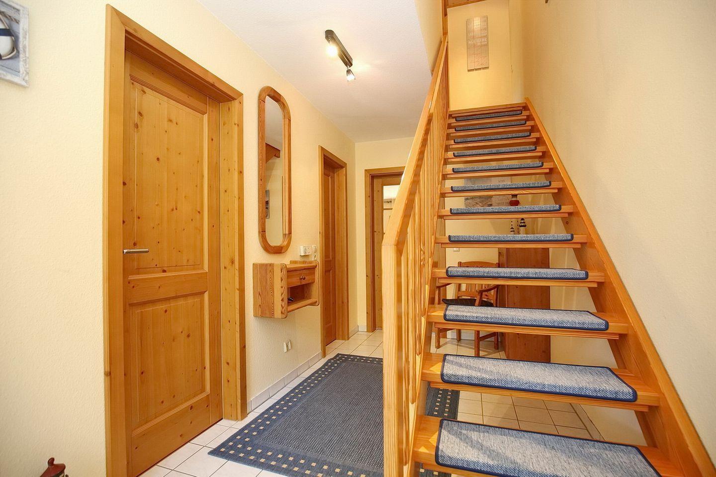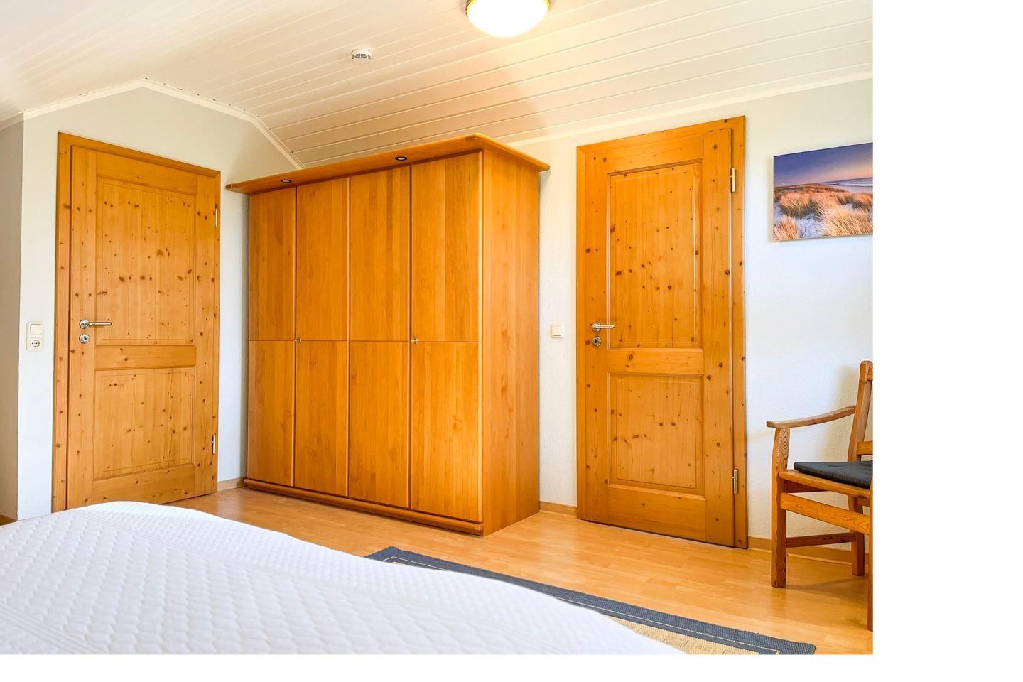 Im oberen Schlafzimmer mit einem zweiten TV-Gerät und DVD-Player stehen als Schlafgelegenheit ein Doppelbett (2 x 90 x 200 cm) und im unteren Schlafzimmer zwei gemütliche Einzelbetten (je 90 x 200 cm) zur Verfügung. Für die kleinen Gäste gibt es kostenlos einen Bollerwagen (ohne Rechtsanspruch).