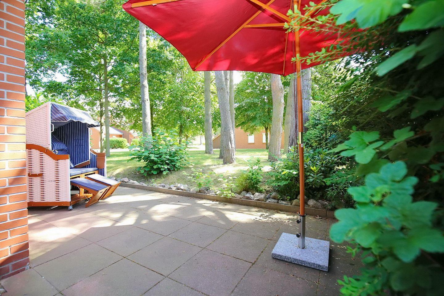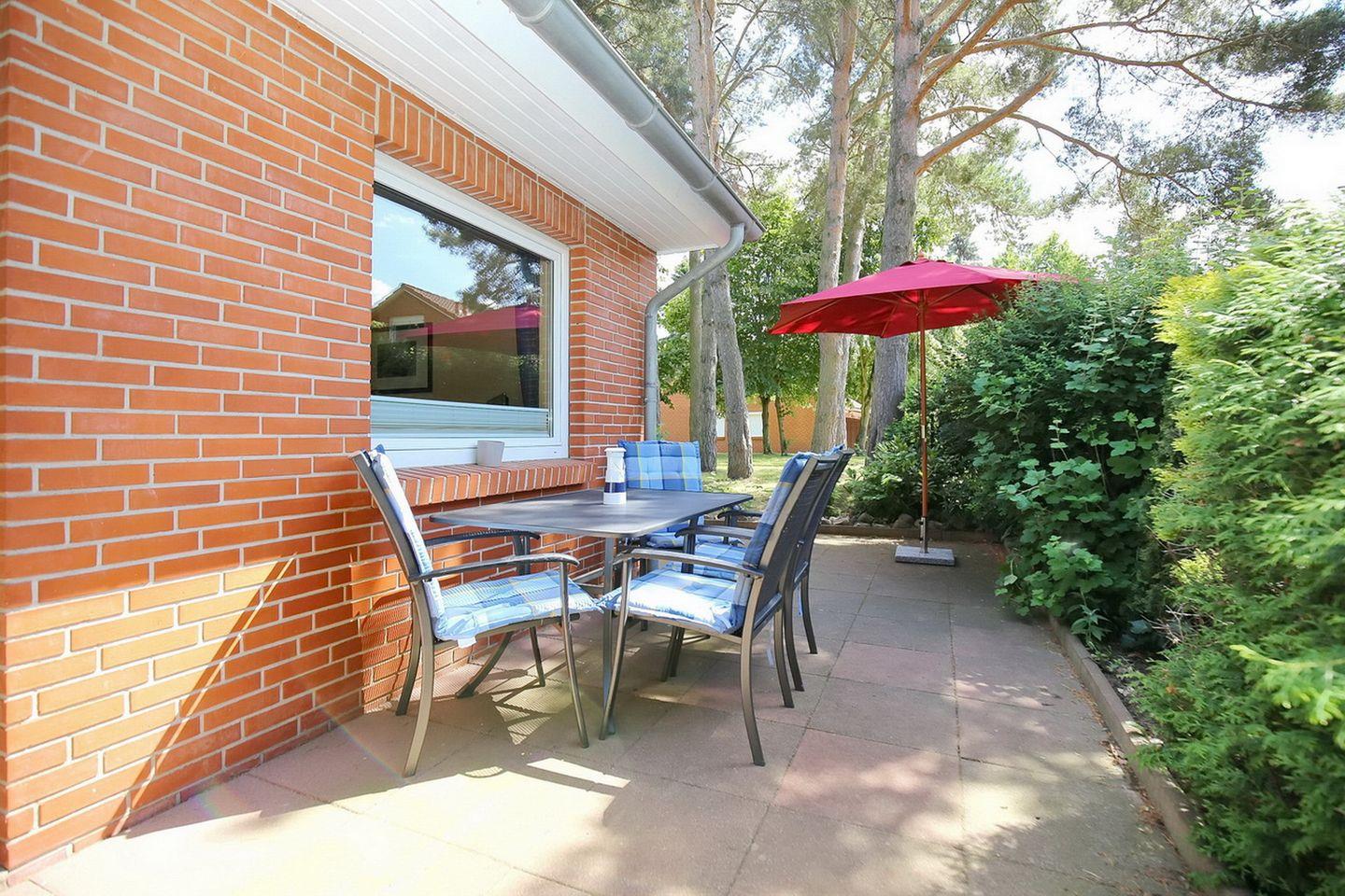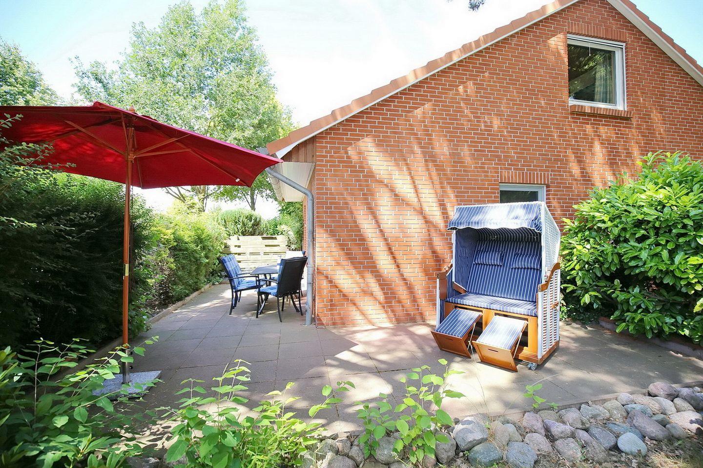 Die große Terrasse ist nach Süd-Ost ausgerichtet und ist mit einem großen Gartentisch, vier Stühlen, einem Sonnenschirm und einem Strandkorb ausgestattet. Da dieses Haus mitten im Grünen liegt, kannst du hier die schöne Aussicht von der Natur genießen.